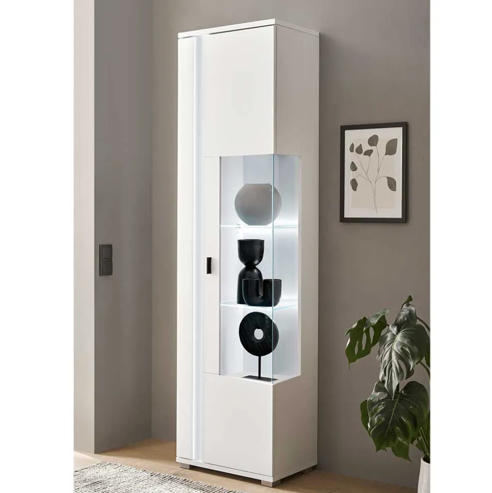 Klare Linien und ein minimalistischer Look prägen das moderne Design dieser Vitrine. Die puristische Gestaltung in Weiß sorgt für eine harmonische und ruhige Optik, die sich perfekt in unterschiedliche Einrichtungsstile einfügt – von modern über skandinavisch bis hin zu klassisch. Die schwarze Griffleiste aus Metall setzt einen edlen Kontrast und verleiht dem Möbelstück einen Hauch von Eleganz. Der Glaseinsatz, der sich raffiniert über Eck zieht, verleiht der Vitrine zudem eine einzigartige Leichtigkeit und Offenheit.