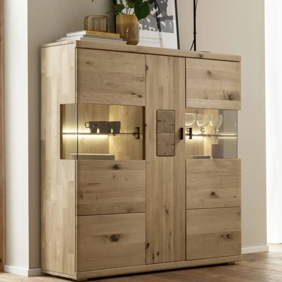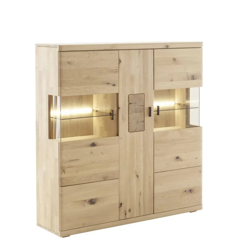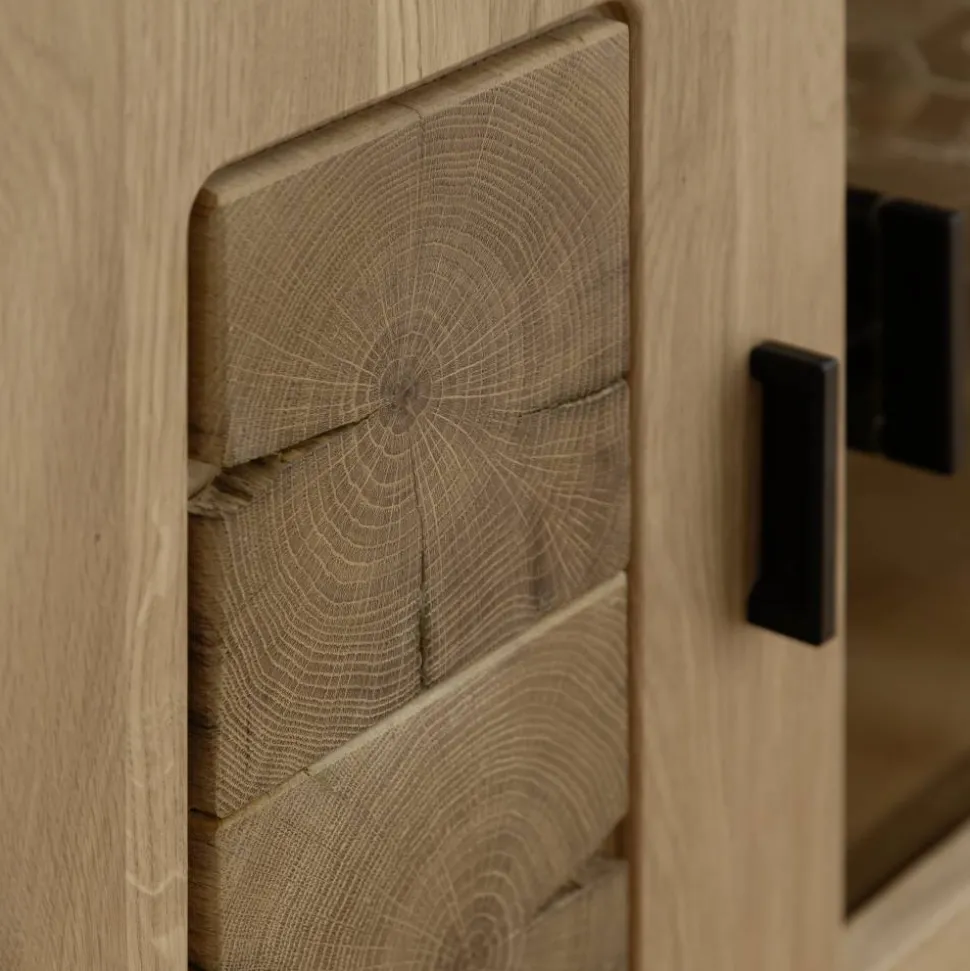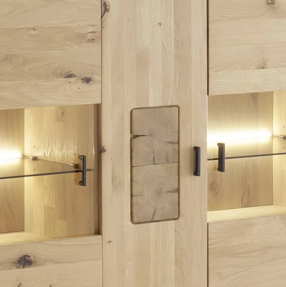 Die Schrankvitrine wird aus astigem Balkeneiche Massivholz gefertigt, dessen helle Oberfläche geölt ist und die lebendige Maserung des Holzes betont. Die Front ist aus durchgehender Lamelle gearbeitet, während der stabile Korpus in robuster Keilzinkung ausgeführt ist. Rückwände mit hellem Echtholzfurnier aus Asteiche werten auch den Innenraum optisch auf, während Parsolglaselemente über Eck den Türen eine elegante Transparenz verleihen. Das mittlere Front-Element wird von einer kunstvoll eingearbeiteten Hirnholzapplikation verziert und unterstreicht die natürliche Qualität des Möbelstücks.