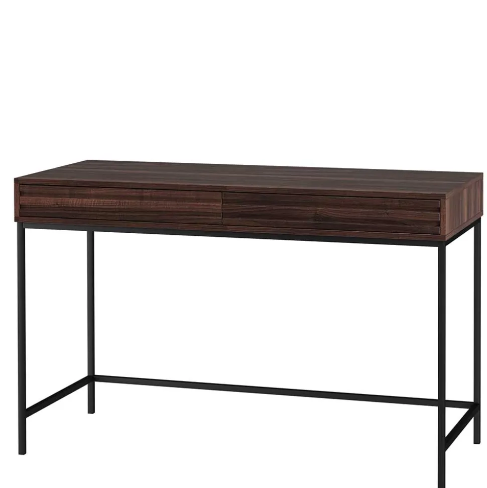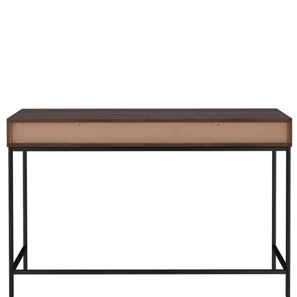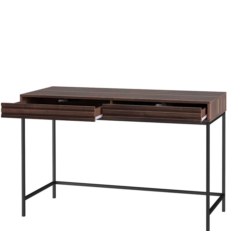 Gefertigt aus MDF und Spanplatte, besticht der Schreibtisch durch seine widerstandsfähige und pflegeleichte Oberfläche in Walnuss-Holzoptik. Das filigrane Vierfußgestell aus schwarzem Metall sorgt nicht nur für Stabilität, sondern unterstreicht zugleich den modernen Look des Möbelstücks. Die Schubladenfronten sind mit dekorativen horizontalen Rillen versehen, die dem Design eine stilvolle Dynamik verleihen.