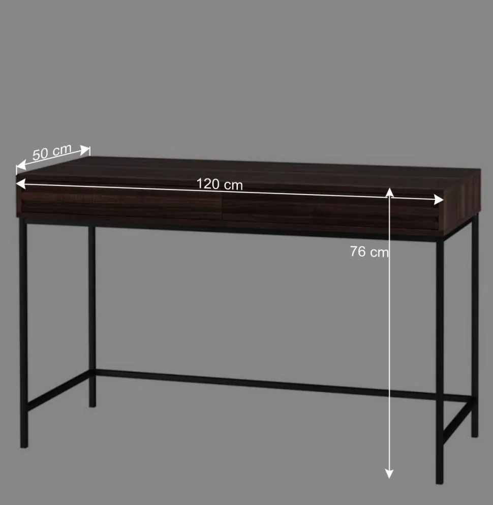Mit einer Breite von 120 cm, einer Höhe von 76 cm und einer Tiefe von 50 cm bietet der Schreibtisch ausreichend Platz zum Arbeiten, ohne sperrig zu wirken. Dank seines schlanken Designs passt er optimal in kleinere Räume und lässt sich flexibel in verschiedene Wohn- und Arbeitsbereiche integrieren. Das Gewicht von ca. 24 kg sorgt für einen sicheren Stand.