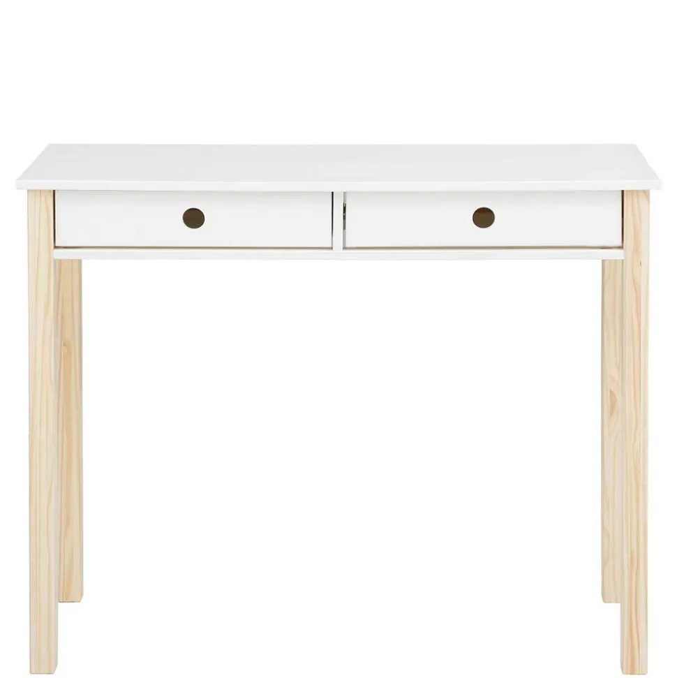 Der Schreibtisch bietet mit zwei Schubladen praktischen Stauraum für Schreibutensilien und Kleinigkeiten. Die Holzauszüge und rund ausgefrästen Grifflöcher in den Schubladenfronten ermöglichen eine einfache Bedienung, während die Innenmaße von je ca. 39,5 x 8 x 32,5 cm für eine optimale Organisation sorgen. Mit einer Belastbarkeit von bis zu 25 kg ist der Schreibtisch auch größeren Anforderungen gewachsen.