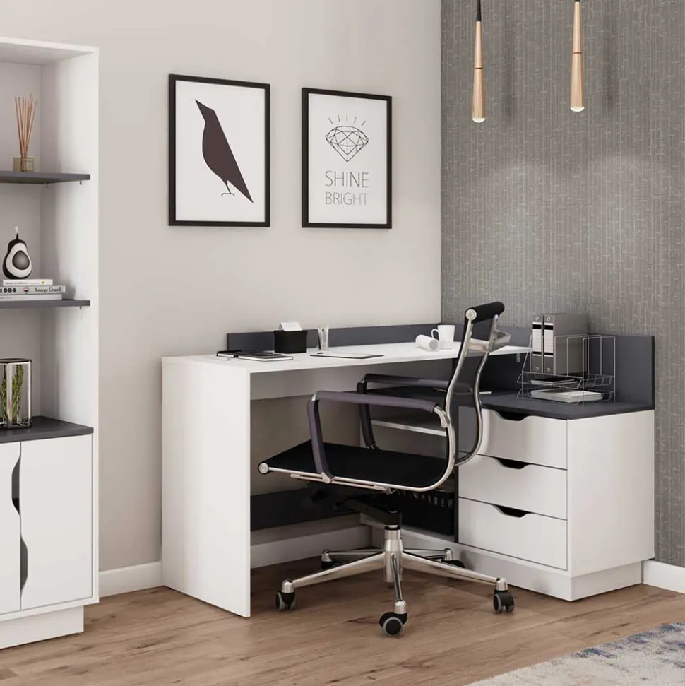 Gefertigt aus robustem Holzwerkstoff (Spanplatte) überzeugt der Schreibtisch mit einer stabilen Bauweise und einem Gewicht von ca. 49 kg. Die pflegeleichte Melaminbeschichtung in Weiß und Anthrazit schützt die Oberflächen vor Kratzern, Feuchtigkeit und Abnutzung – perfekt für den täglichen Einsatz. Das stabile Wangengestell und der Sockel am Schrankelement sorgen für zusätzliche Stabilität und eine lange Lebensdauer.