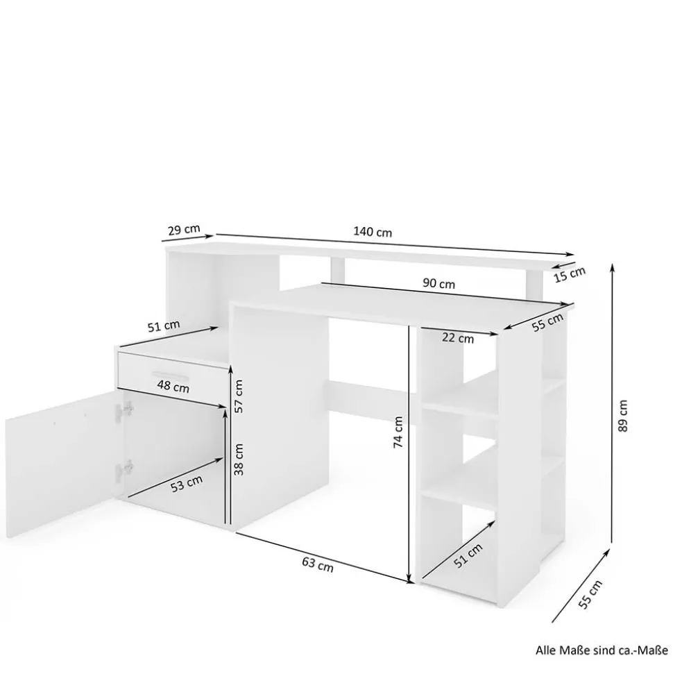 Mit einer Schublade inklusive Metallauszug, einer Ablage für den Drucker, drei offenen Regalfächern und einem großzügigen Staufach hinter der Tür bietet der Schreibtisch „Caveira“ vielfältige Stauraummöglichkeiten. Die Tischplatte mit einer Höhe von ca. 75,6 cm und einer Stärke von ca. 1,6 cm gewährleistet eine angenehme Arbeitsfläche. Zudem ist der Schreibtisch mit einer zusätzlichen Ablage für den Monitor und einer Knieraumblende ausgestattet, die ein komfortables Arbeiten ermöglichen.