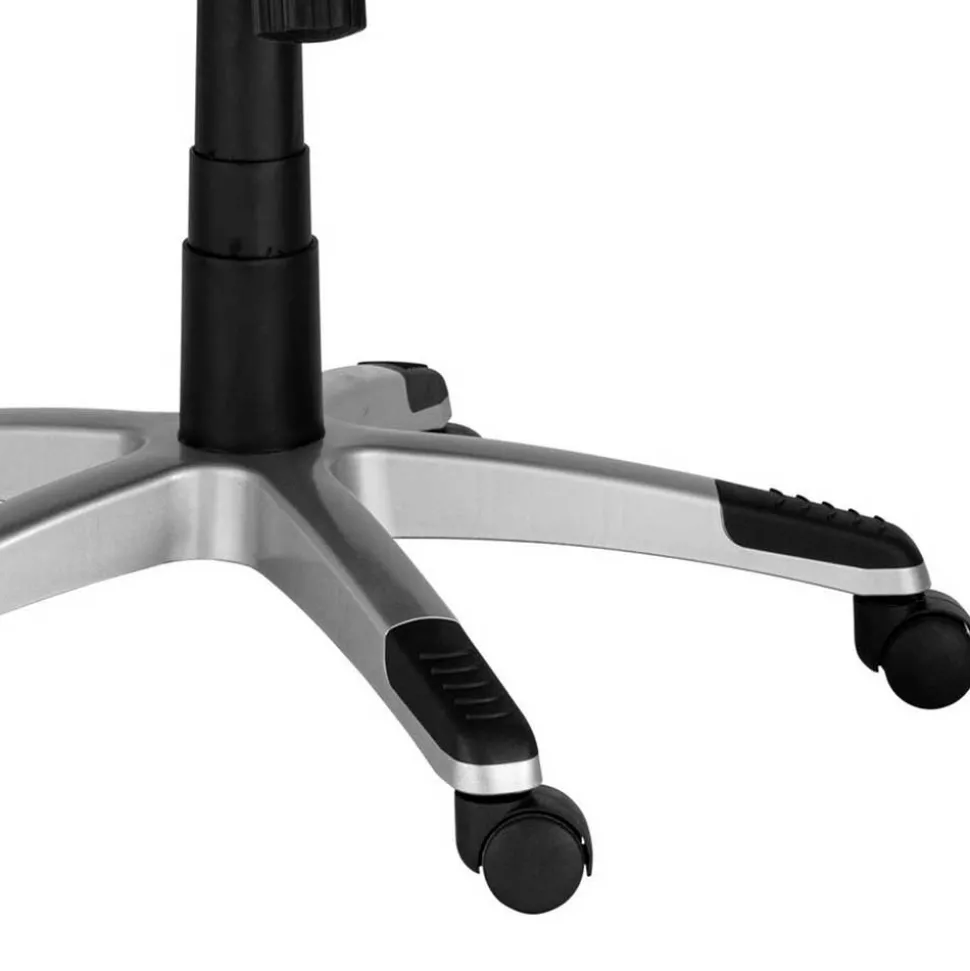 Das stabile Kreuzgestell in Silberfarben und die Kunststoff-Universalrollen ermöglichen eine flexible Beweglichkeit und sicheren Stand. Die Armlehnen mit einer Breite von ca. 8 cm und einer Höhe von ca. 67 cm sowie die Sitzbreite von 48 cm und Sitztiefe von 52 cm bieten zusätzlichen Komfort.
