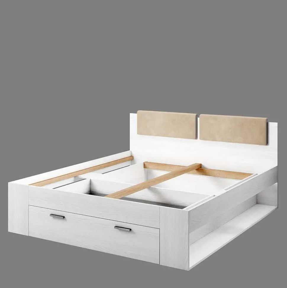 - Praktische Bettschublade am Fußende und seitliche, offene Stauraumfächer