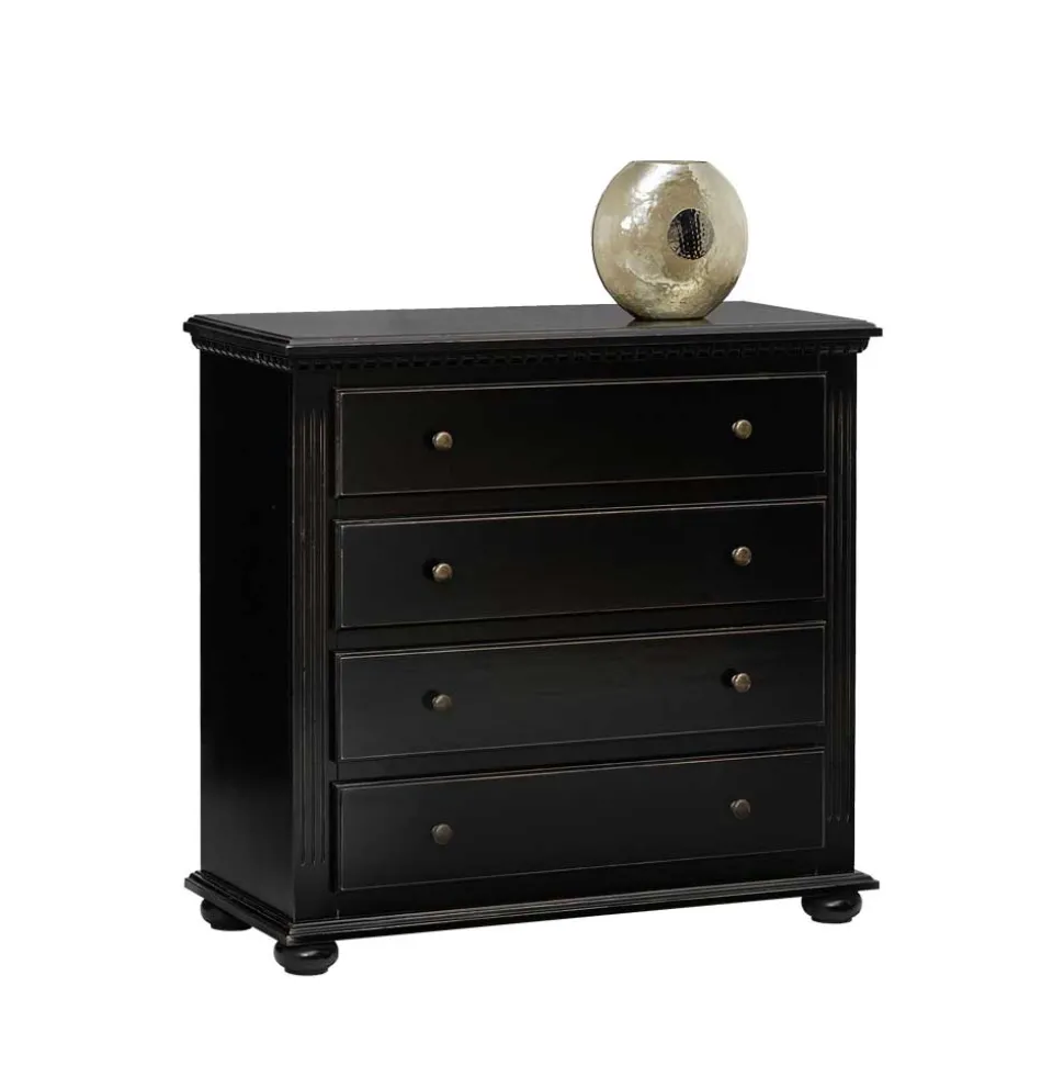 Die durchscheinende Holzmaserung und die handwerklich attraktiven Fräsungen machen jede Kommode zum Unikat. Diese Detailverliebtheit zeigt sich auch in den fein gearbeiteten, kleinen Knopfgriffen aus Metall im Antik-Design, die nicht nur optisch beeindrucken, sondern auch haptisch ein Erlebnis bieten. Mit einer Breite von 95 cm und einer Höhe von 90 cm bietet „Mamaia“ vier großzügige Schubladen, die reichlich Platz für Ihre Wohntextilien, Kleidungsstücke oder andere persönliche Gegenstände bieten.