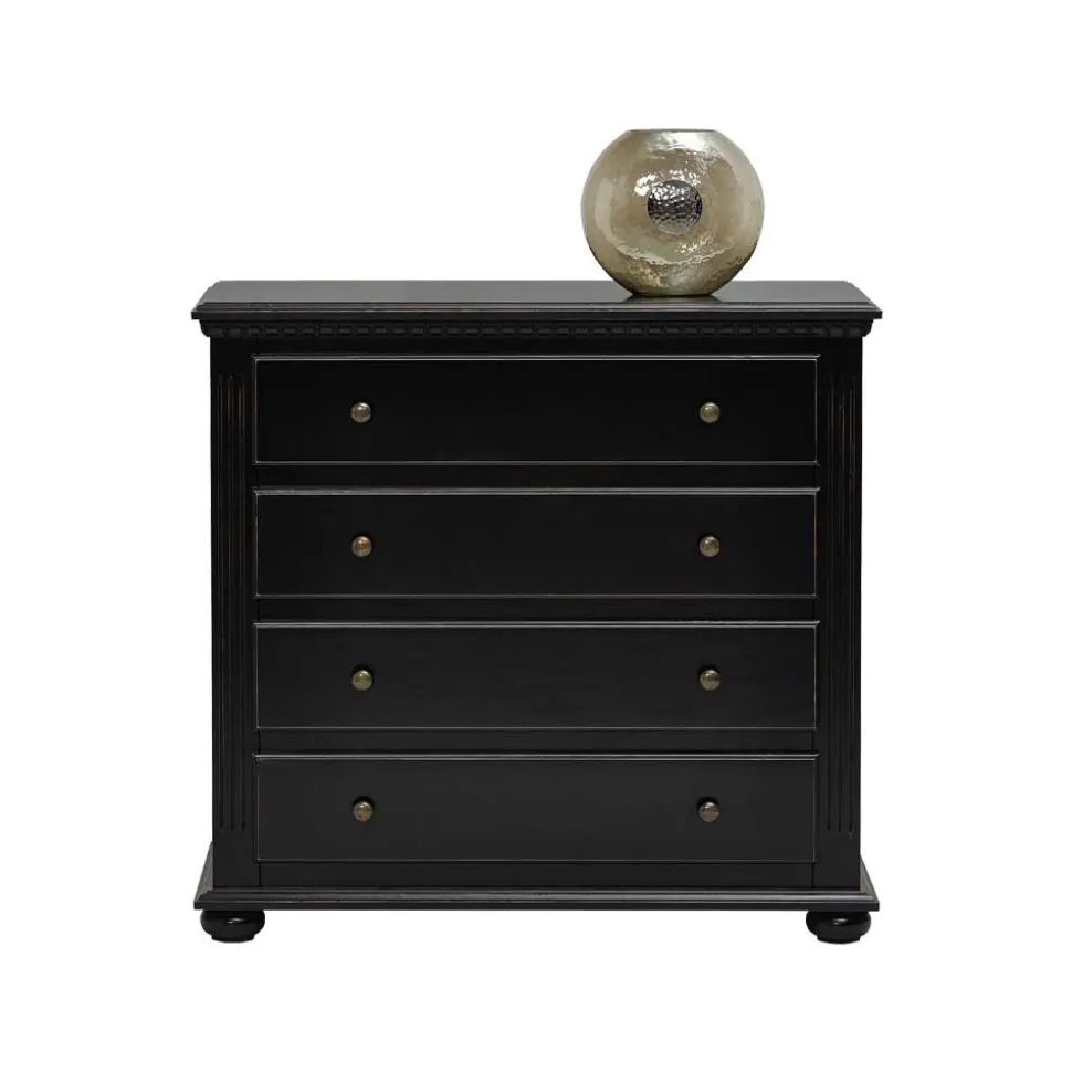 Vertrauen Sie auf die hervorragende Schreinerqualität, die in jedem Millimeter der Kommode spürbar ist. Die massive Rückwand aus Spanplatte gewährleistet eine zusätzliche Stabilität, während die gedrechselten Kugelfüße nicht nur für einen sicheren Stand sorgen, sondern auch das exquisite Design abrunden.