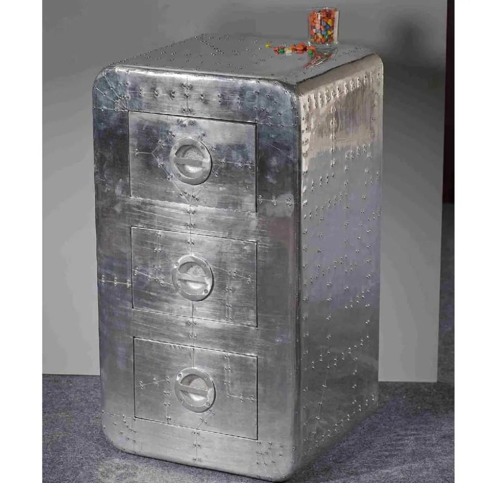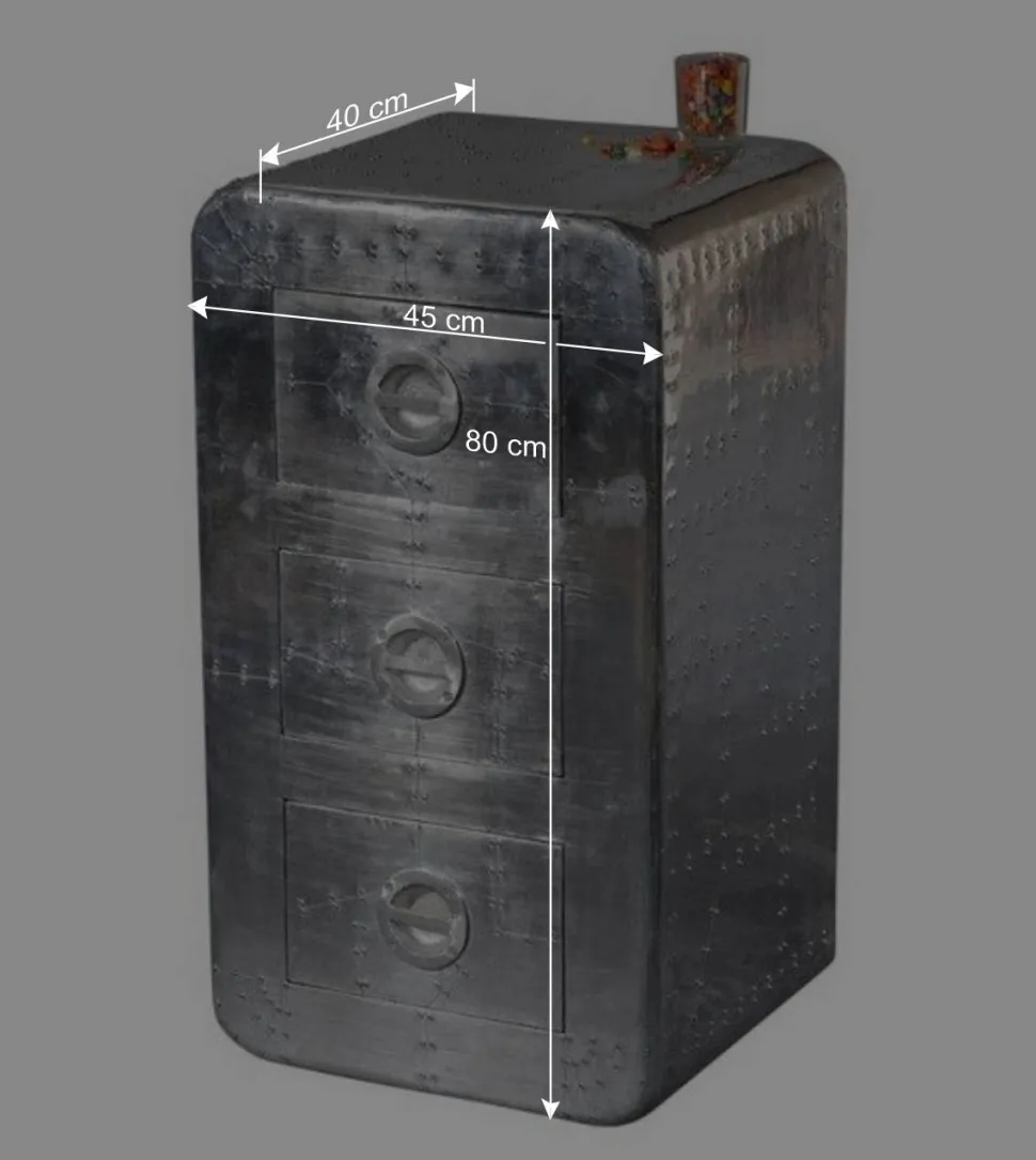 Die Oberfläche unserer Schubladenkommode ist komplett mit Aluminium beschlagen und mit auffälligen Zierschrauben versehen – eine Hommage an die mutigen Designs des Flugzeugbaus. Diese einzigartigen Details machen die „Pilot“ zu einem echten Eyecatcher in jedem Raum. Die abgerundeten Korpuskanten, umrahmt von feinem Metall, verstärken die industrielle Anmutung und sorgen zugleich für eine geschmeidige, sichere Haptik.
