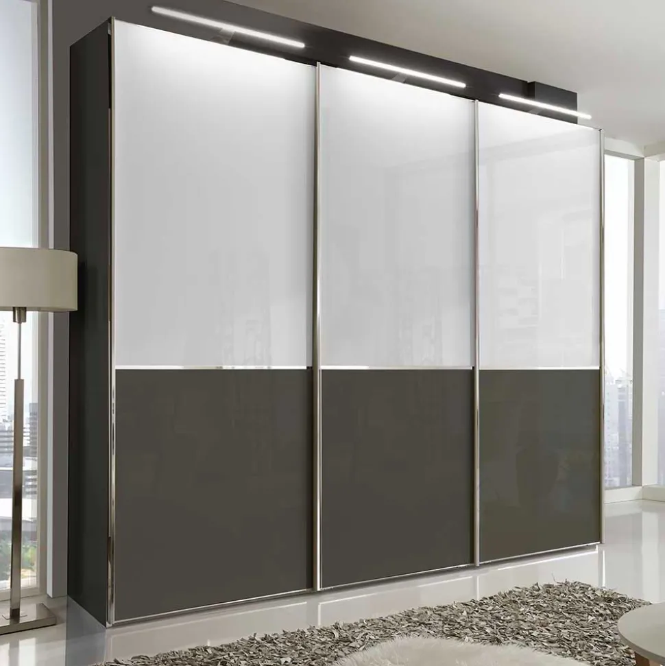Mit seinen großzügigen Maßen von 280 cm Breite, 67 cm Tiefe und 236 cm Höhe – optional erhöht auf 242 cm durch LED-Aufbauleuchten – bietet der Schrank enorm viel Stauraum. Die drei leichtlaufenden Schwebetüren, ideal für Räume mit begrenztem Platzangebot, ermöglichen einen bequemen Zugang ohne zusätzlichen Raumbedarf. Im Inneren warten drei Facheinheiten, jeweils ausgestattet mit zwei Einlegeböden und einer robusten Kleiderstange aus Metall.