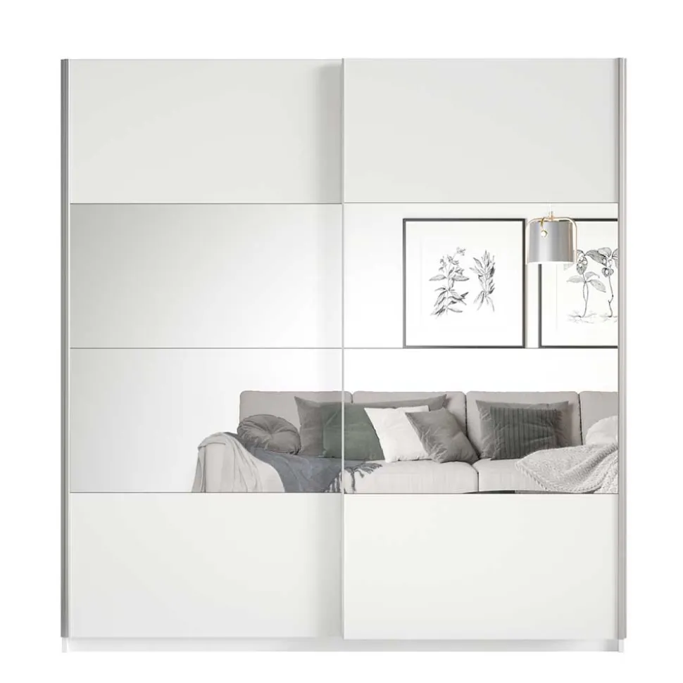 Zwei breite, leichtgängige Schiebetüren gleiten sanft zur Seite und bieten bequemen Zugang zum Innenleben. Die dezenten Griffleisten fügen sich harmonisch in das minimalistische Gesamtbild ein. Die großen Spiegelblenden auf den Türfronten sind nicht nur stilvolle Eyecatcher, sondern reflektieren das Licht auf angenehme Weise – das lässt den Raum größer, heller und freundlicher wirken. Und ganz nebenbei sparen Sie sich den zusätzlichen Standspiegel im Schlafzimmer.
