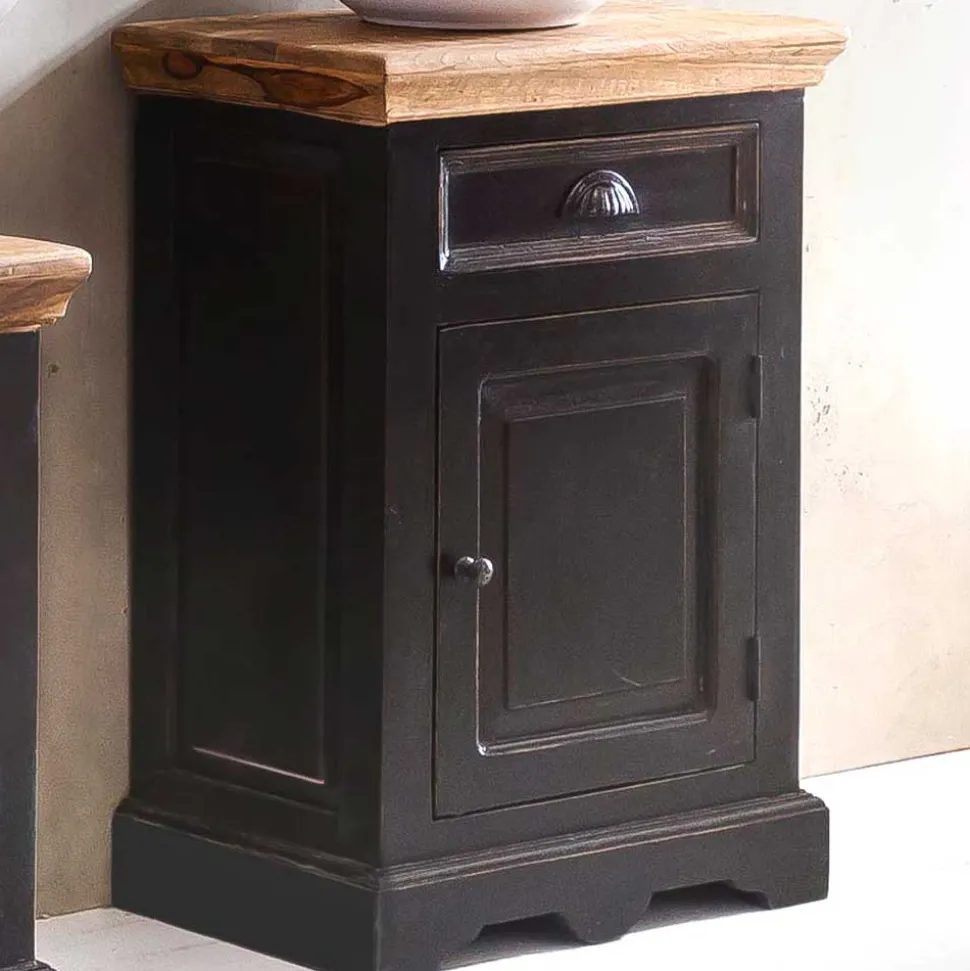 Die Möbel dieses Sets sind in schwarz mit einem Antik Finish lackiert, das den Kolonialstil unterstreicht. Die Deckplatten aus Massivholz sind honigfarbig lackiert, was einen optischen Akzent setzt und das Badezimmer mit einer natürlichen Ausstrahlung belebt. Die beabsichtigten Gebrauchsspuren auf den Oberflächen tragen zum Charme des Sets bei und erzeugen eine gemütliche, wohnliche Atmosphäre.