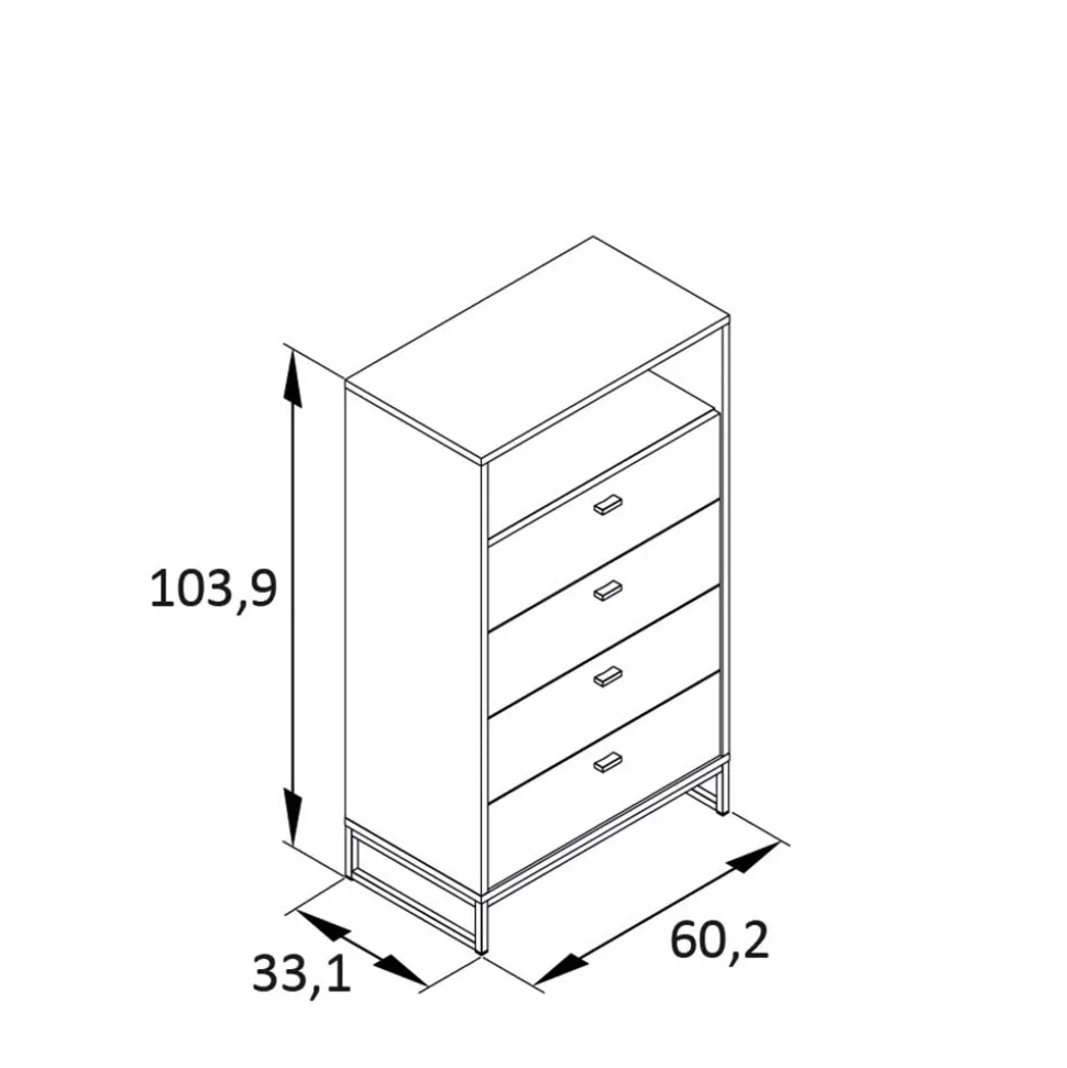 Die Hochkommode ergänzt das Set perfekt und bietet mit ihren vier Schubladen und einem offenen Fach weiteren Stauraum für Kleidung, Accessoires oder alltägliche Gegenstände. Mit den Maßen 60 cm Breite, 104 cm Höhe und 33 cm Tiefe ist sie die ideale Lösung für kleinere Räume, in denen jede Stellfläche optimal genutzt werden soll. Die Schubladen auf stabilen Metallauszügen gleiten mühelos und bieten großzügigen Platz für all Ihre Utensilien. Auch hier runden die matten, graugrün melaminbeschichteten Oberflächen und die schwarzen Metallgriffleisten das Design stimmig ab. Ein schwarzes Metallbügelgestell sorgt für einen sicheren Stand; eine Kippsicherung wird empfohlen.