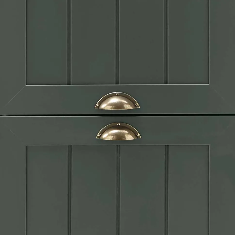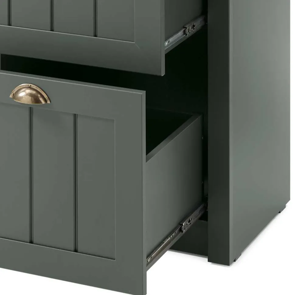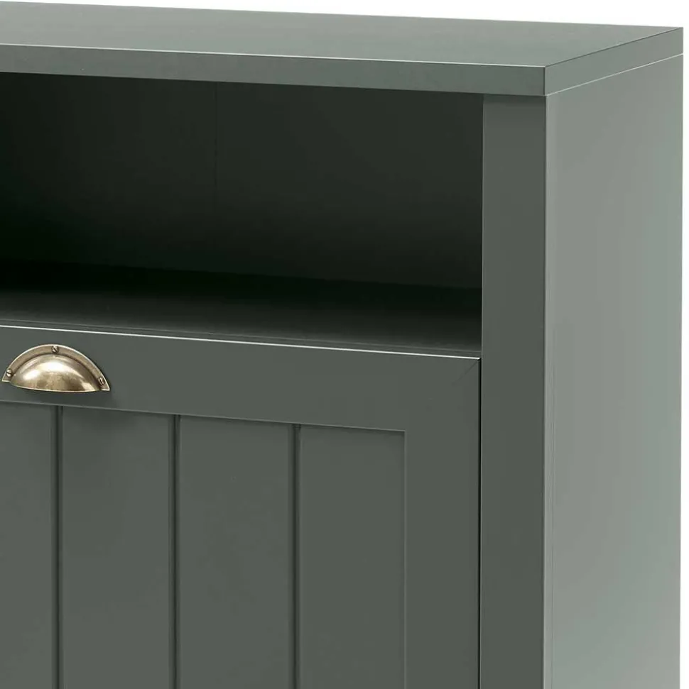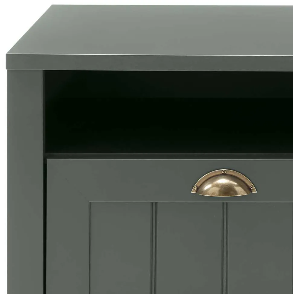 Die Verwendung langlebiger Spanplatte im Korpus garantiert stabile Standfestigkeit und eine langanhaltende Funktionalität, während MDF in der Front für eine glatte, hochwertige Optik sowie eine gleichmäßige Farbdarstellung sorgt. Beide Werkstoffe überzeugen durch ihre Robustheit und Formbeständigkeit, wodurch das Möbelstück auch bei täglicher Nutzung dauerhaft ein elegantes Erscheinungsbild behält. Melaminbeschichtete Oberflächen in edlem Dunkelgrün bieten neben einem stilvollen Farbbild zudem eine hohe Strapazierfähigkeit und Pflegeleichtigkeit, da das Melaminverfahren das Material mit einer widerstandsfähigen Schutzschicht überzieht, die Kratzern und Gebrauchsspuren effektiv vorbeugt.