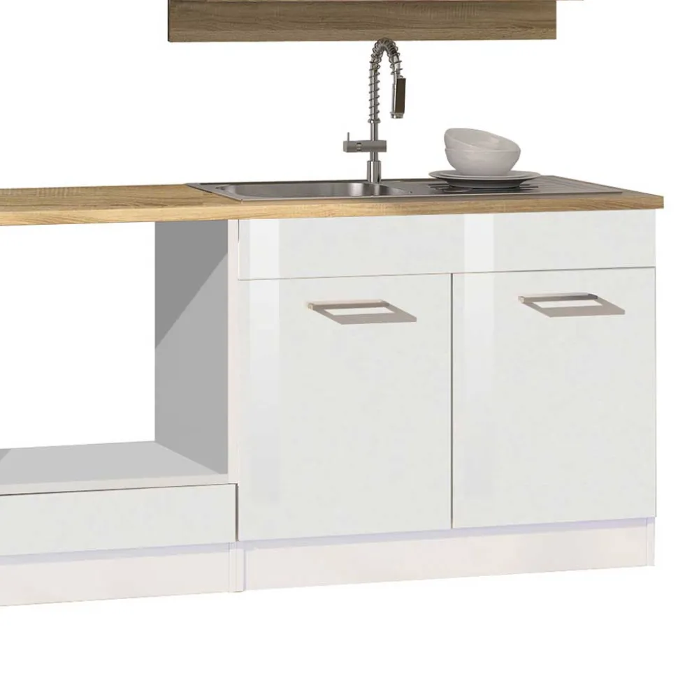 Der integrierte Spülenschrank enthält ein pflegeleichtes Spülbecken aus Edelstahl, das besonders robust und hygienisch ist. Bitte beachten Sie, dass die Armatur und der Ausschnitt für die Arbeitsplatte nicht im Lieferumfang enthalten sind – so haben Sie die Möglichkeit, diese nach Ihren individuellen Wünschen zu gestalten.
