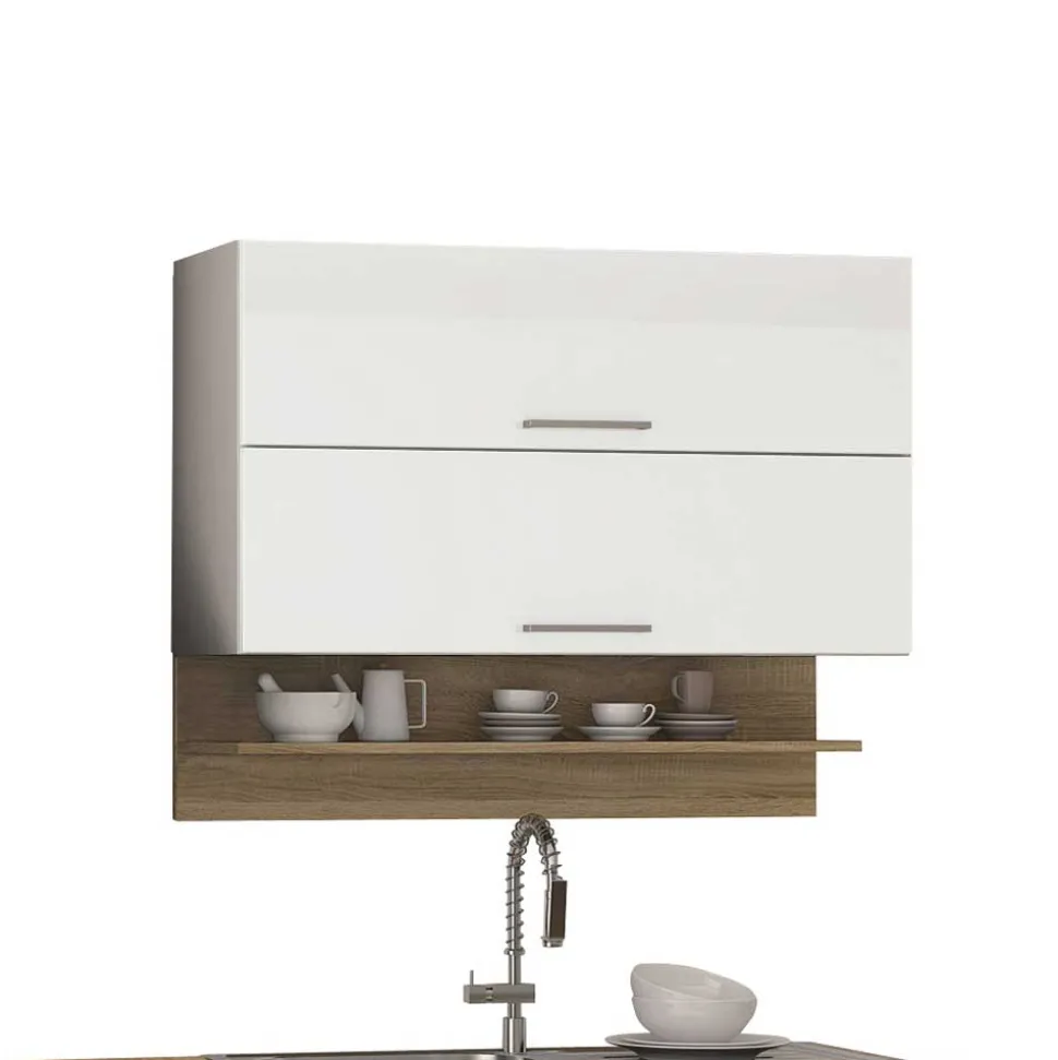 Der Herdumbau ist speziell dafür konzipiert, Ihren Herd elegant zu integrieren und fügt sich nahtlos in das Gesamtbild ein. Für zusätzliche Aufbewahrung sorgen der praktische Hängeschrank und der Klapp-Hängeschrank, die viel Platz für Geschirr, Gläser und Vorräte bieten. Der Kühlschrankumbau passt sich perfekt Ihrer Küche an und schafft eine clevere Lösung zur Verkleidung Ihres Kühlschranks. Zwei moderne Wandboards bieten zusätzliche Ablagefläche für Dekorationen oder häufig genutzte Küchengegenstände.