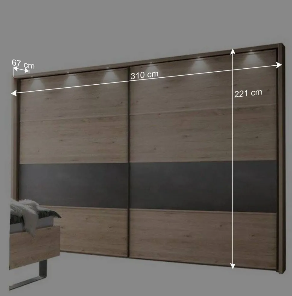 Der geräumige Schwebetürenschrank (310 x 221 x 67 cm) bietet mit seinen drei großzügigen Fachelementen jede Menge Platz für Kleidung, Accessoires und mehr. Die leichtgängigen Schwebetüren mit farblich abgestimmten Aufleistungen in Schiefer- und Eichefarben lassen sich dank der langen Griffleisten aus Metall mühelos öffnen. Hinter den Türen befinden sich drei Fachelemente, die jeweils mit zwei Einlegeböden und einer Kleiderstange ausgestattet sind – so bleibt alles stets ordentlich und übersichtlich. Der Passepartout-Rahmen mit sechs integrierten Leuchten setzt den Schrank besonders in Szene und verleiht ihm eine luxuriöse Ausstrahlung.