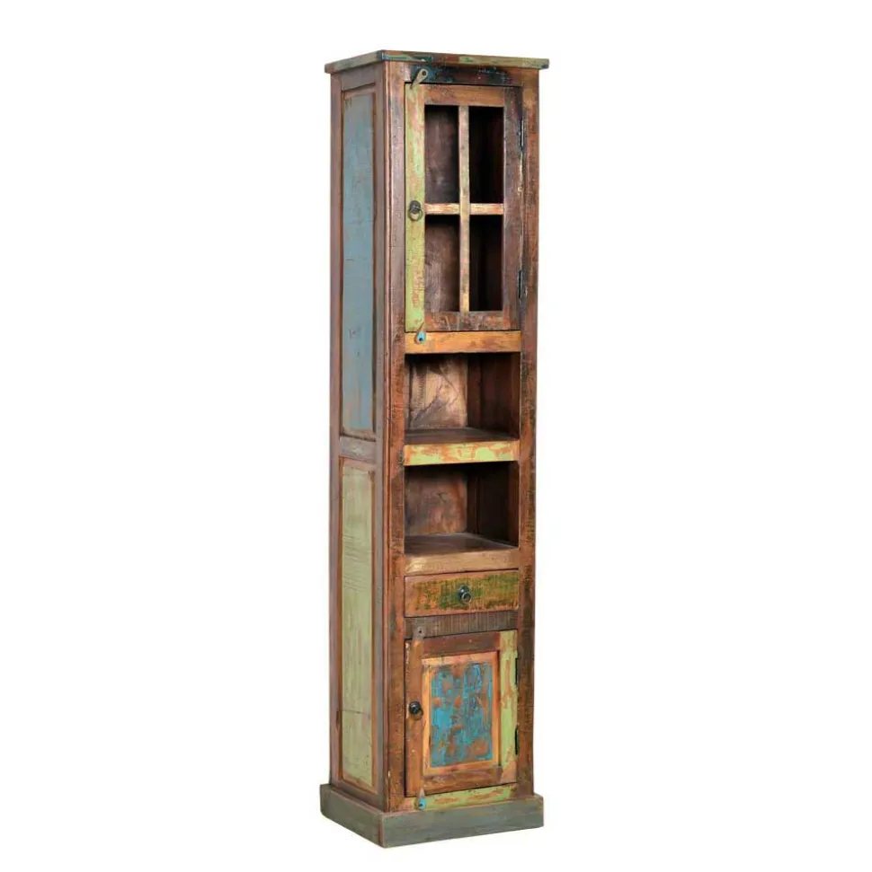 Die Holzoberflächen sind kunstvoll in verschiedenen Farben lackiert und verleihen jedem Möbelstück eine lebendige und fröhliche Note. Die Farbreste auf dem Holz erzählen von einer bewegten Vergangenheit und schaffen eine warme und einladende Atmosphäre in Ihrem Badezimmer.