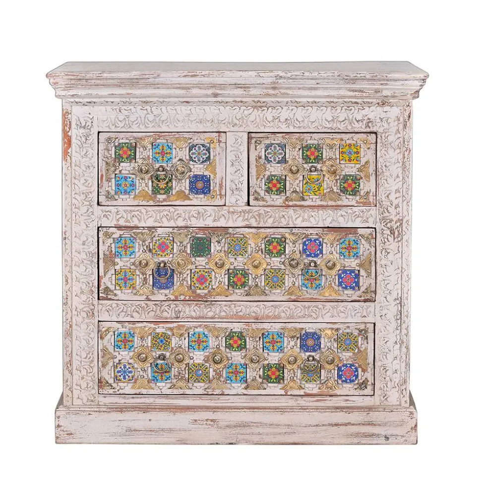 Die Shabby Chic Kommode „Mirell“ ist mehr als nur ein Möbelstück – sie ist ein Statement! Mit ihrer attraktiven Farbgebung in Antikweiß und bunten Akzenten bringt sie frischen Wind in Ihr Zuhause. Ideal platziert im Wohnzimmer, Schlafzimmer oder Flur, wird sie zum charmanten Mittelpunkt und bietet gleichzeitig praktischen Stauraum für Ihre Schätze. Jede Kommode wird in liebevoller Handarbeit aus hochwertigem Mangobaumholz gefertigt und ist damit ein wahres Unikat, das Charakter und Stil in Ihre Räume bringt.
