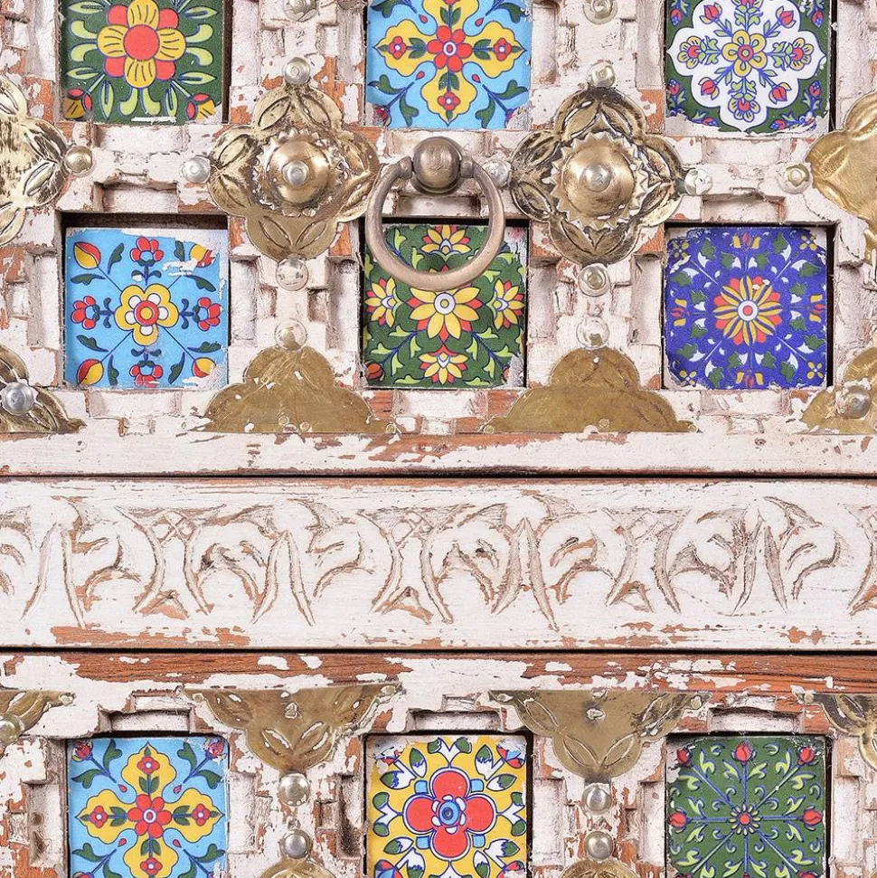 Die „Mirell“ ist aus massivem Mangobaumholz gefertigt, das für seine Robustheit und natürliche Schönheit bekannt ist. Die Holzoberflächen sind mit einem White Wash Effekt behandelt, der die einzigartigen Maserungen des Holzes hervorhebt. Um das nostalgische Design perfekt abzurunden, sind die Kommode und die Schubladenfronten mit bunten Keramikfliesen dekoriert, die wunderschöne florale Ornamente zeigen. Die bronzefarbigen Ringgriffe und Beschläge aus Metall verleihen der Kommode einen eleganten Akzent, während die gefrästen Kanten der Deckplatte und des Sockels die exquisite Verarbeitung unterstreichen.