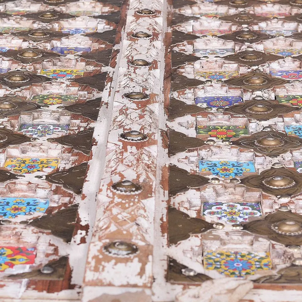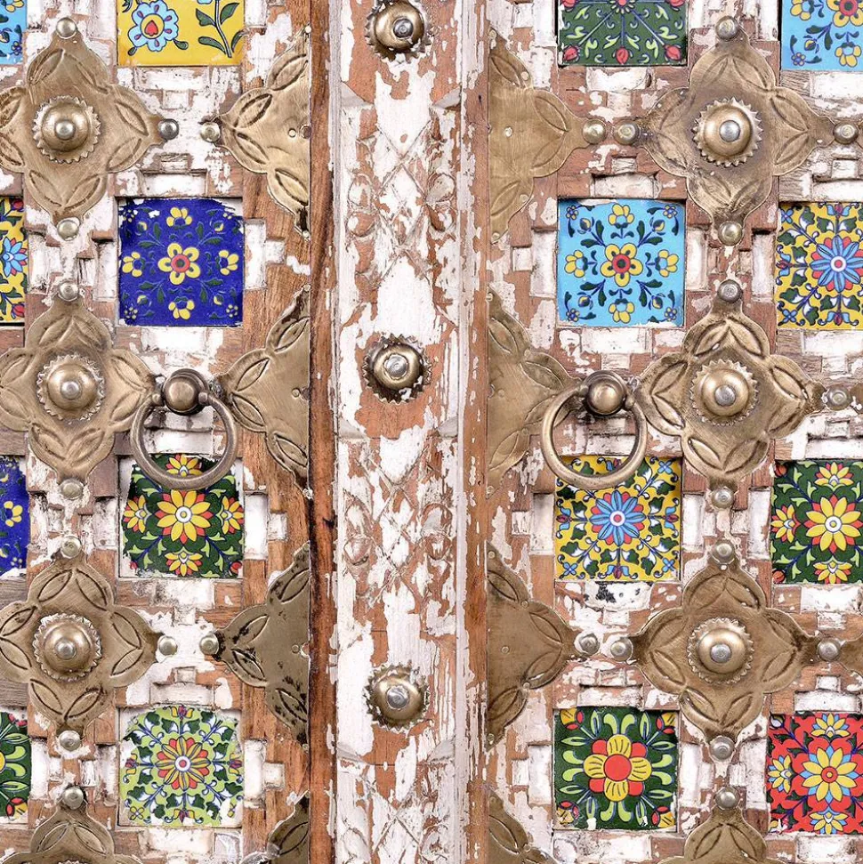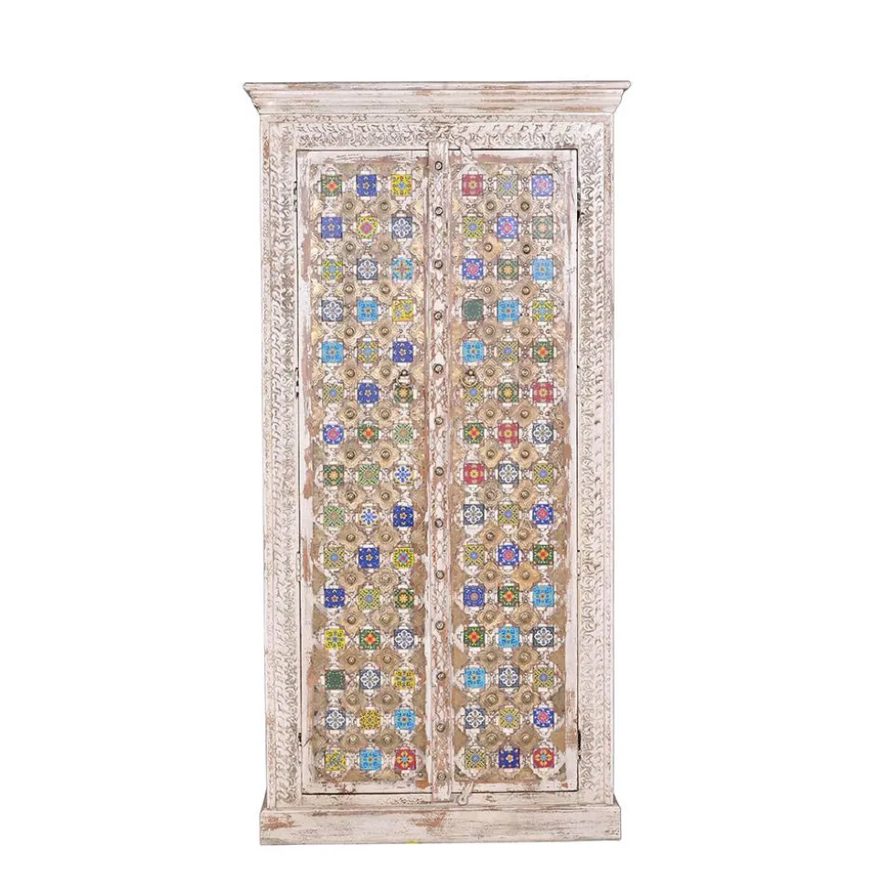 Verleihen Sie Ihrem Zuhause mit dem Garderobenschrank „Mirell“ im charmanten Shabby Chic Stil eine unvergleichliche Atmosphäre. Die antikweiße Lackierung in Kombination mit bunten Keramikfliesen und floralen Ornamenten auf den Türen macht dieses Möbelstück zu einem Blickfang, der traditionelle Eleganz mit einer lebhaften Note verbindet. Gefertigt aus hochwertigem Mangobaum Massivholz, überzeugt der Schrank nicht nur optisch, sondern auch durch seine herausragende Qualität. Jedes Stück ist ein handgefertigtes Unikat – einzigartig in Farbe, Struktur und Beschaffenheit.