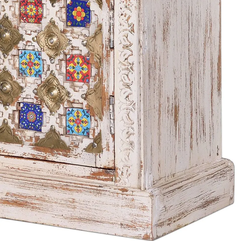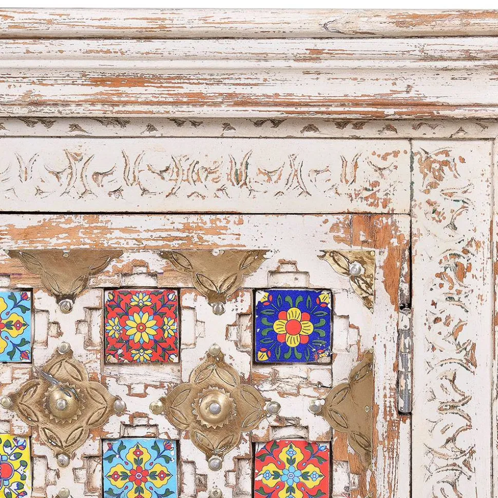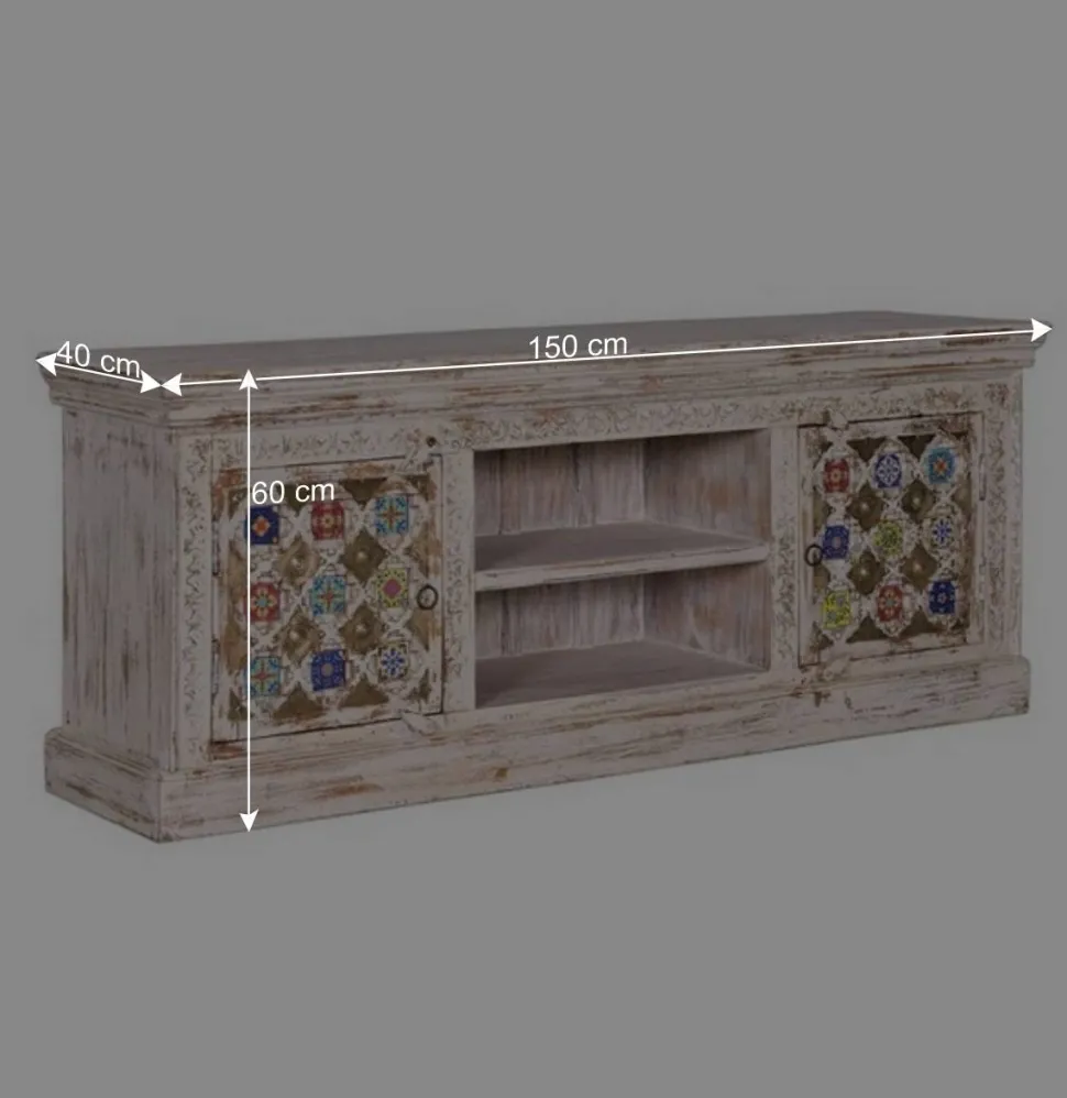 Gefertigt aus massivem Mangobaumholz, strahlt die „Mirell“ nicht nur Qualität aus, sondern ist auch ein echter Hingucker. Die Holzoberflächen sind behutsam mit einem White Wash Effekt behandelt, wodurch die natürliche Maserung des Holzes wunderbar zur Geltung kommt. Verziert mit hübschen Keramikfliesen, die florale Ornamente präsentieren, unterstreicht dieses TV Lowboard die Liebe zum Detail. Die bronzefarbigen Ringgriffe und Beschläge aus Metall fügen sich perfekt in das Gesamtbild ein und sorgen für eine nostalgische Note. Die Deckplatte und der Sockel sind mit gefrästen Kanten versehen, was die Hochwertigkeit dieses Möbelstücks noch einmal betont. Durch die handwerkliche Fertigung ist jedes Lowboard ein Unikat mit eigenen Farbnuancen und Strukturen.