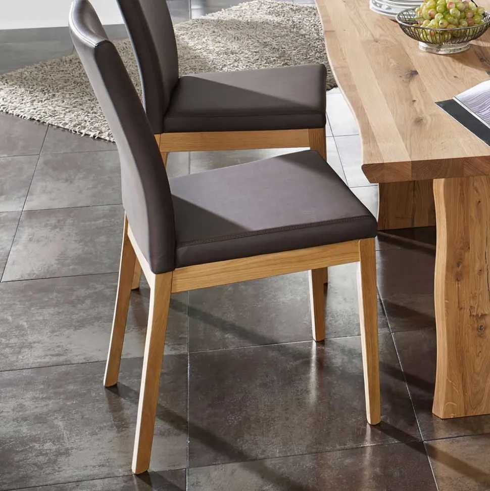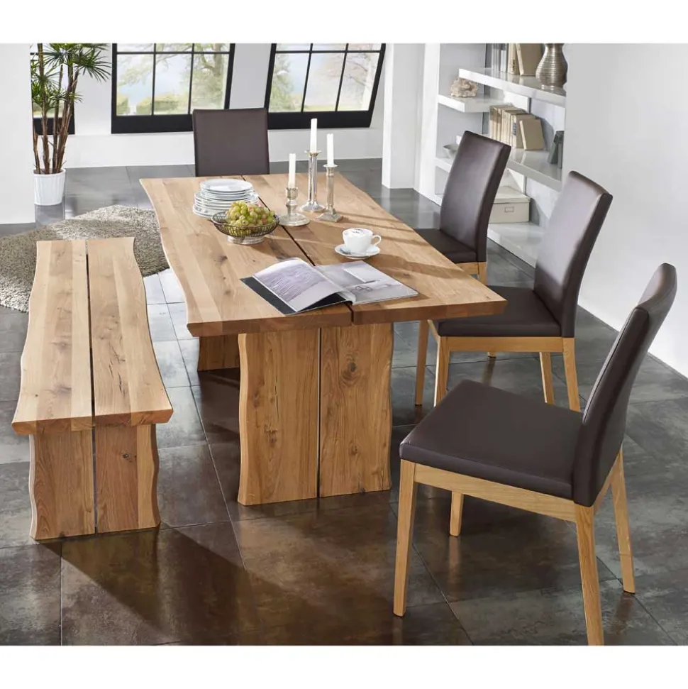 Klare Linienführung, harmonische Proportionen und eine ausdrucksstarke Materialwahl – Sympatia vereint modernes Design mit dem Charme handwerklicher Natürlichkeit. Die geölte Wildeichefarbe des Massivholzes bringt Wärme und Behaglichkeit in den Raum, während die dunkelbraunen Kunstlederbezüge an Sitzbank und Stühlen für einen modernen, eleganten Kontrast sorgen. In Kombination ergibt sich ein Gesamtbild, das sowohl durch Natürlichkeit als auch durch stilvolle Zurückhaltung besticht.