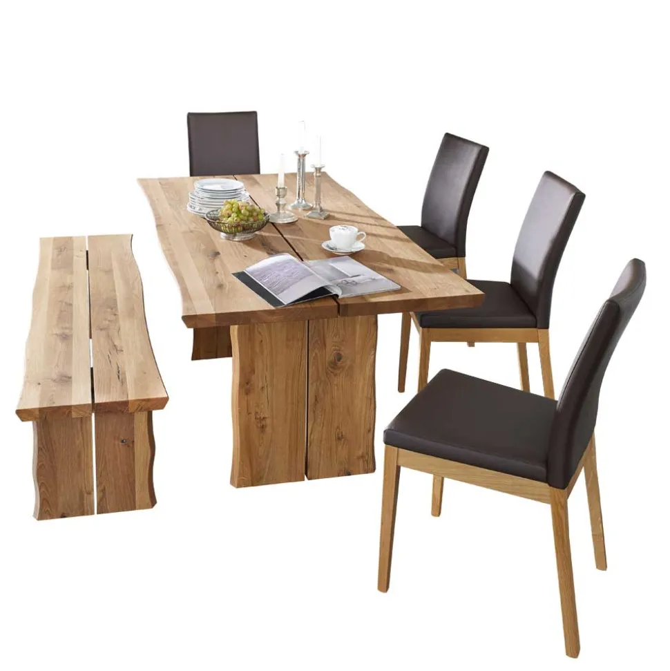 Bestehend aus einer markanten Bank, vier bequemen Stühlen und einem stilvollen Tisch, bietet die Sitzgruppe Sympatia alles, was ein gemütlicher und zugleich stilvoller Essbereich braucht. Die Kombination aus geöltem Wildeichefarbton und dunklen, elegant wirkenden Sitzbezügen in Dunkelbraun verleiht diesem Ensemble eine warme, einladende Ausstrahlung – ideal für moderne Wohnkonzepte mit einer Prise rustikaler Authentizität.