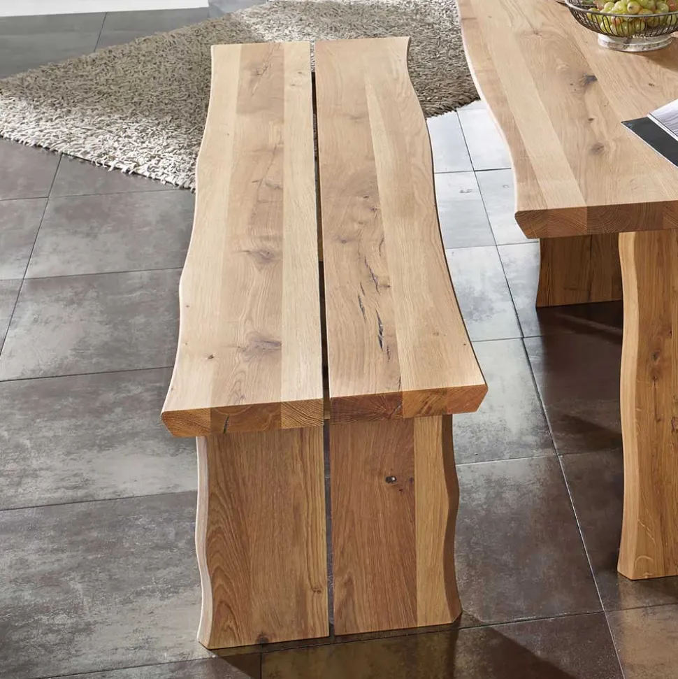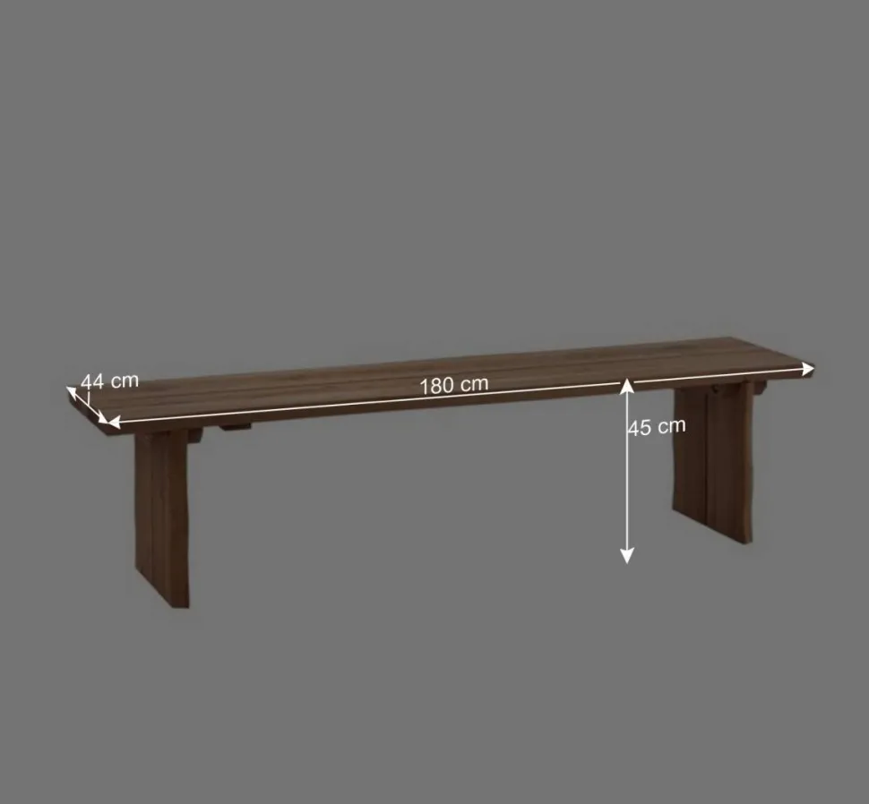 Die Bank beeindruckt mit ihrer massiven Sitzfläche, bestehend aus zwei Platten, die durch einen mittigen Spalt getrennt sind – ein gestalterisches Detail, das den individuellen Charakter des Holzes unterstreicht. Natürliche Baumkanten, sichtbare Gebrauchsspuren und Windrisse verstärken die ursprüngliche Ausstrahlung. Die dunklen Sitzbezüge aus Polyurethan-Kunstleder setzen einen eleganten Akzent und bieten angenehmen Sitzkomfort. Mit einer Sitzhöhe von 45 cm eignet sich die Bank ideal für komfortables Sitzen bei jeder Mahlzeit. Das solide Wangengestell aus Holz verleiht dem Möbelstück hohe Standfestigkeit und ergänzt die rustikale Optik perfekt.