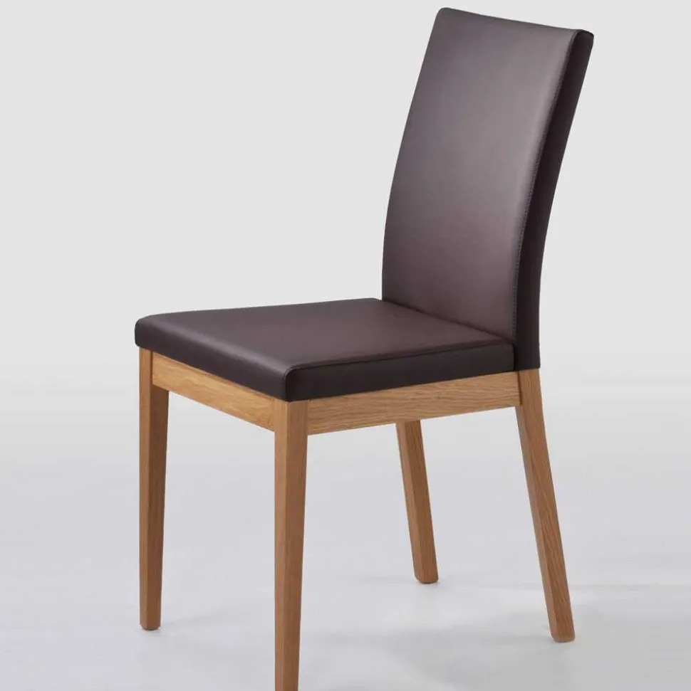 Ergänzt wird das edle Massivholz durch Sitzflächen aus Kunstleder in sattem Dunkelbraun – gefertigt aus 100 % Polyurethan. Dieses Material ist nicht nur optisch überzeugend, sondern bietet auch praktische Vorteile im Alltag: Es ist besonders widerstandsfähig, pflegeleicht und dabei angenehm weich. Flecken lassen sich mühelos abwischen, ohne dass Komfort oder Optik darunter leiden.