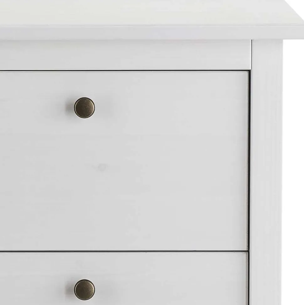 Die weiß lackierten Holzoberflächen sind ein Highlight für das Auge. Sie verleihen der Kommode einen modernen Touch, während die leicht durchscheinende Holzmaserung die Natürlichkeit des Kieferholzes hervorhebt. Dieses Spiel zwischen zeitgemäßem Design und natürlicher Holzoptik schafft eine harmonische Balance und veredelt das Gesamtbild der Kommode.