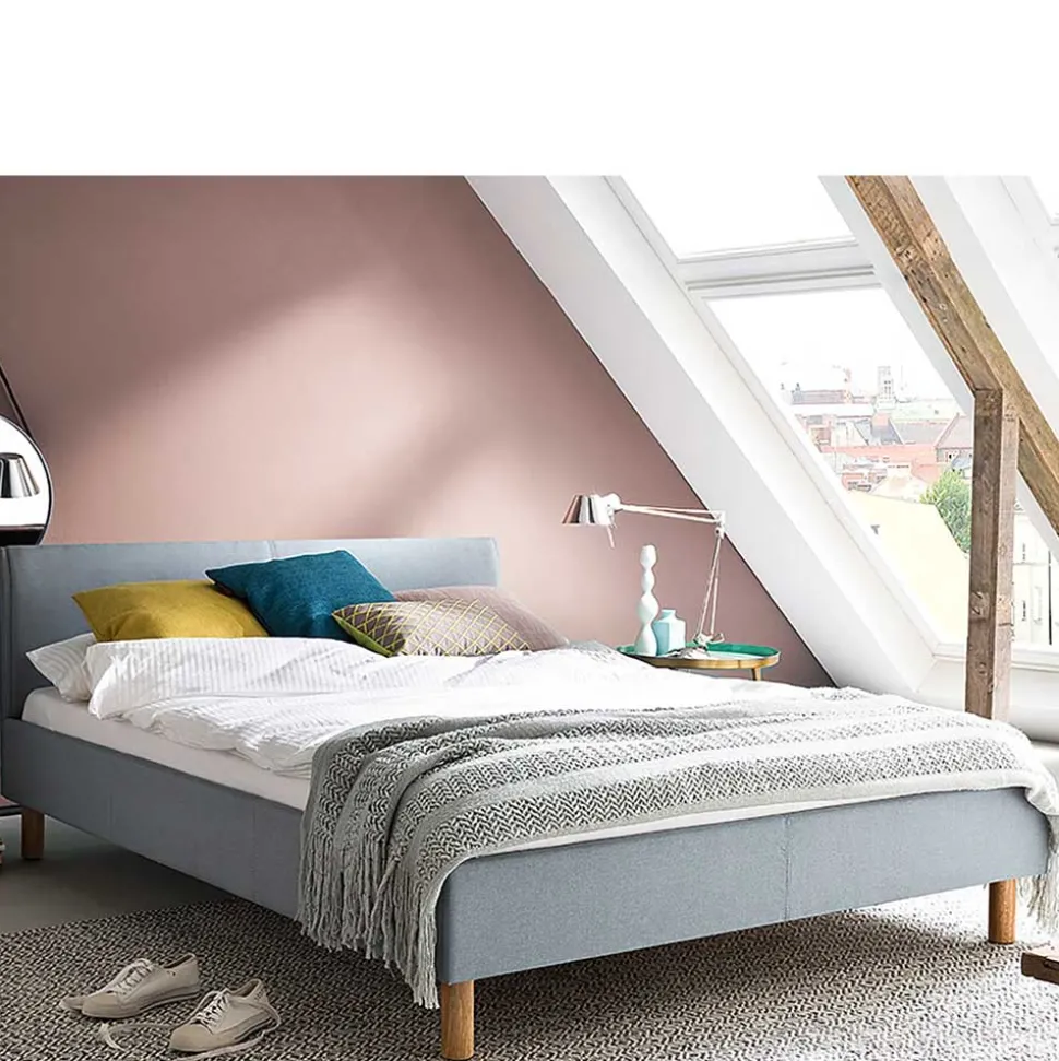 - Dezentes Polsterbett in Hellblau und Eichefarben