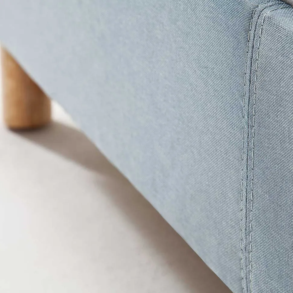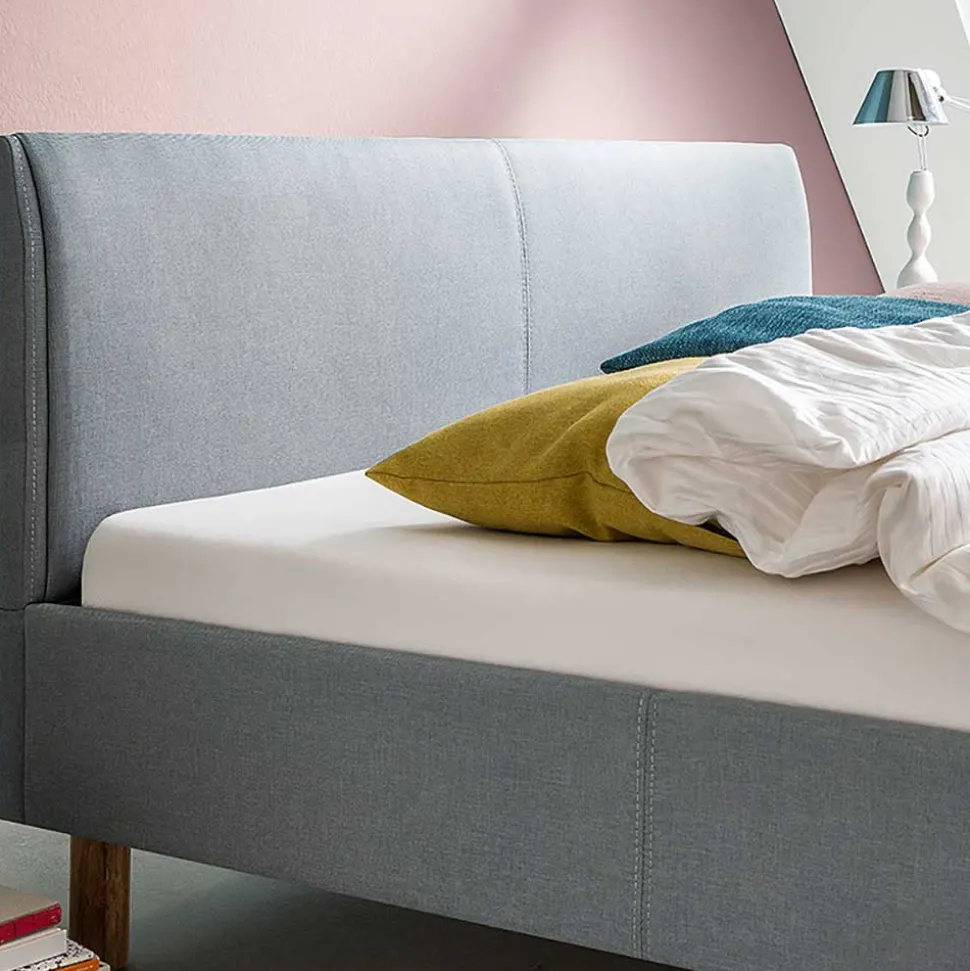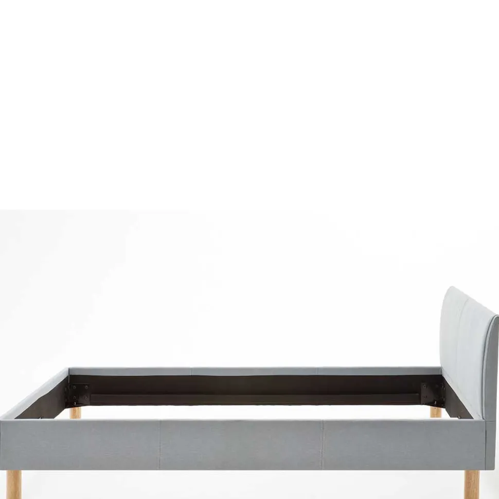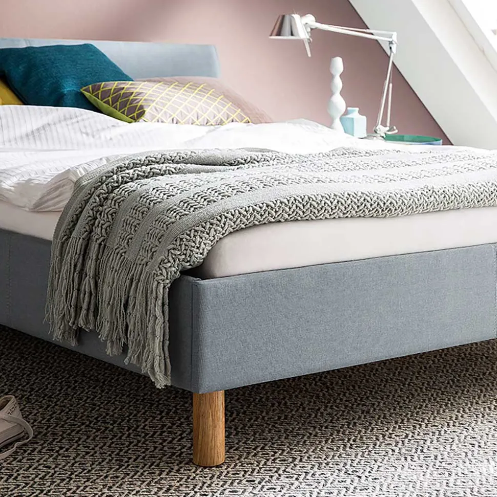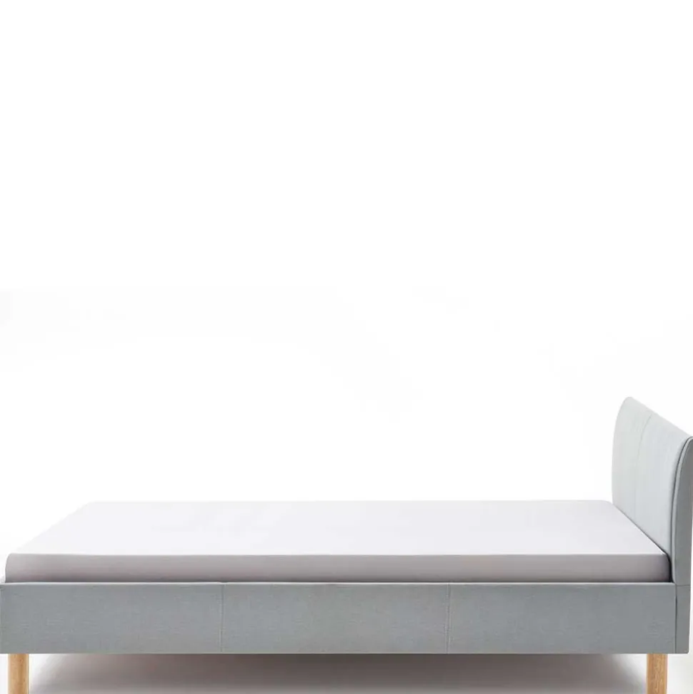 Der Bettrahmen und das Kopfteil sind komplett mit dem hochwertigen hellblauen Webstoff bezogen, was für eine harmonische und moderne Optik sorgt. Dank der stabilen Konstruktion aus Spanplatte und den zusätzlichen Stützfüßen am Mittelsteg bietet das Bett eine hohe Stabilität und ist bis zu 120 kg belastbar. Das Vierfußgestell aus massivem Eichenholz in Eichefarben setzt einen warmen, natürlichen Akzent und sorgt für den nötigen Halt.