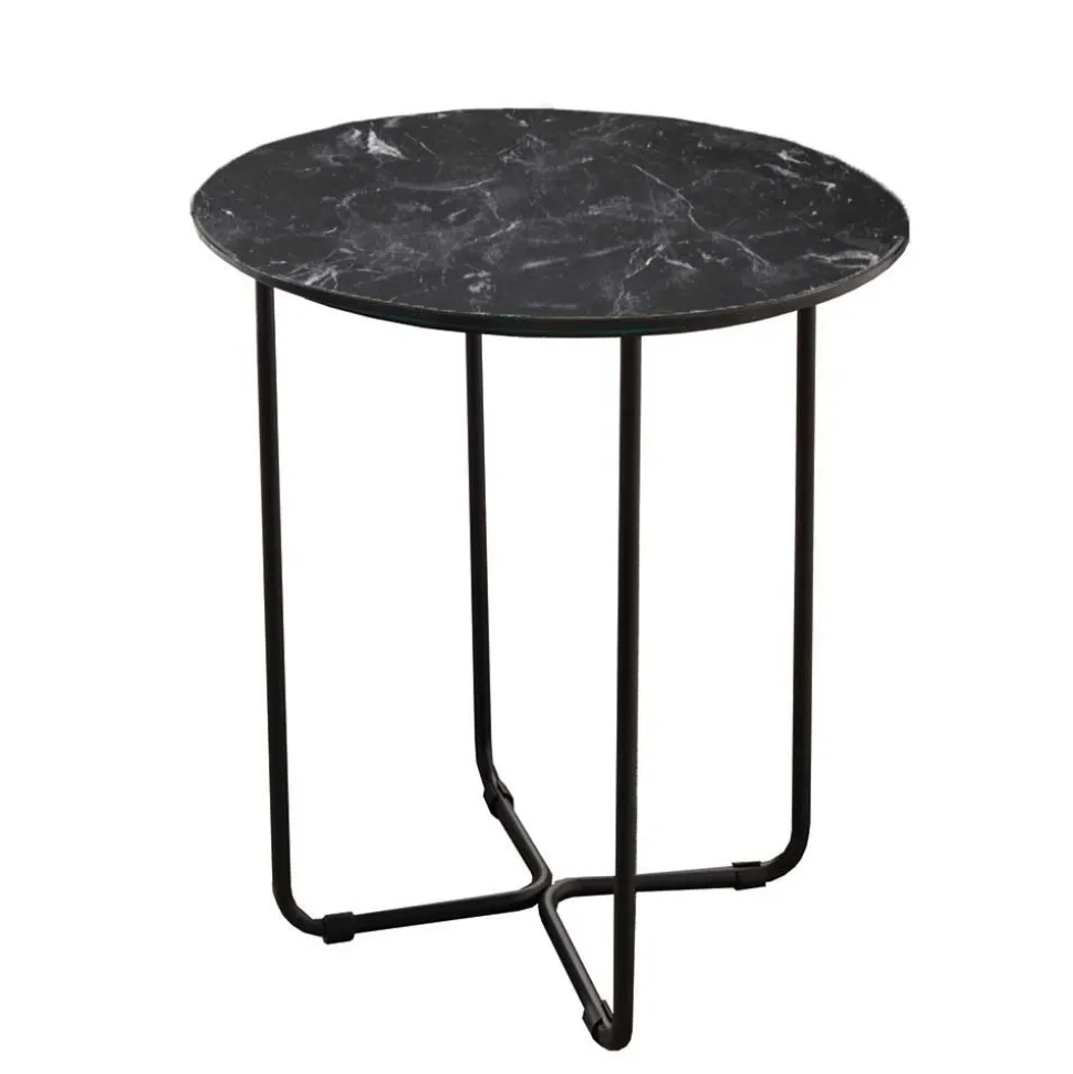 Die Tischplatte aus hochwertigem Glas ist von unten mit einer edlen Marmoroptik in Schwarz und Hellgrau marmoriert foliert – ein visueller Hochgenuss, der an echten Naturstein erinnert. Die glatte, kühle Oberfläche fühlt sich nicht nur angenehm unter der Hand an, sondern ist auch besonders pflegeleicht und langlebig schön. Die Haptik überzeugt sofort: Hier spüren Sie die Qualität, noch bevor Sie die erste Tasse Kaffee abstellen.
