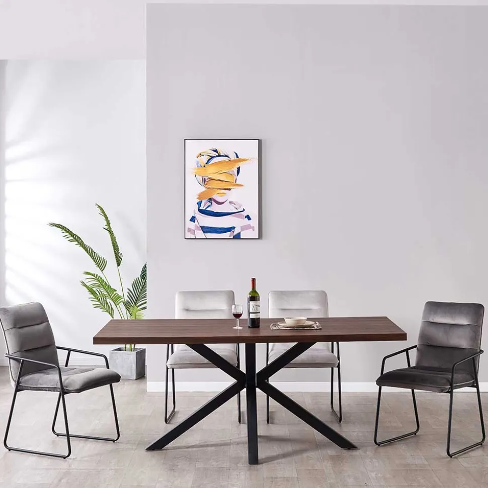 Gleich vier Stühle und ein markanter Tisch bilden gemeinsam ein harmonisches Ensemble, das moderne Wohnträume wahr werden lässt. „Mendoza“ steht für pure Ästhetik im angesagten Industry- und Loft-Stil – einer Stilrichtung, die sich durch ihre kraftvolle, urbane Ausdrucksweise und gleichzeitig wohnliche Wärme auszeichnet. Kühles Metall trifft auf warme Holztöne und elegante Stoffe, wodurch ein stimmiges Gesamtbild entsteht, das sowohl in großzügigen Lofts als auch in modernen Wohn- und Essbereichen perfekt zur Geltung kommt.