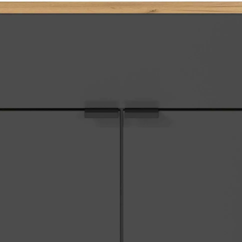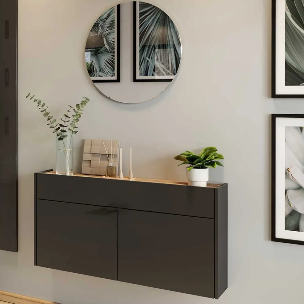 Ein stilvoller Eingangsbereich ist die Visitenkarte eines Zuhauses. „Sidgarus“ überzeugt mit klaren Linien, harmonischen Farbkontrasten und clever durchdachter Funktionalität. Dunkelgraue Fronten setzen einen edlen Akzent, während die Wildeichefarben Wärme und Natürlichkeit vermitteln. Durch die Kombination von Spanplatte und hochwertigem Spiegelglas entsteht ein Möbelstück, das nicht nur optisch beeindruckt, sondern auch langlebig und pflegeleicht ist.