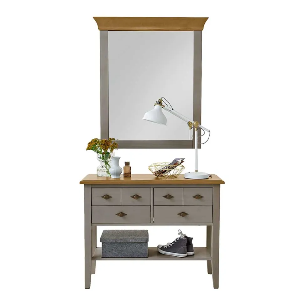 Ein stabiler Stand ist bei Möbeln im Landhausstil von großer Bedeutung, und das „Cempino“ Set erfüllt diesen Anspruch perfekt. Die Kommode steht sicher auf einem robusten Vierfußgestell, das nicht nur für Stabilität sorgt, sondern auch optisch perfekt zum rustikalen Design passt. Der Spiegel lässt sich mühelos an der Wand montieren, was besonders in kleineren Räumen von Vorteil ist, da er wertvollen Platz spart und gleichzeitig den Raum optisch vergrößert.