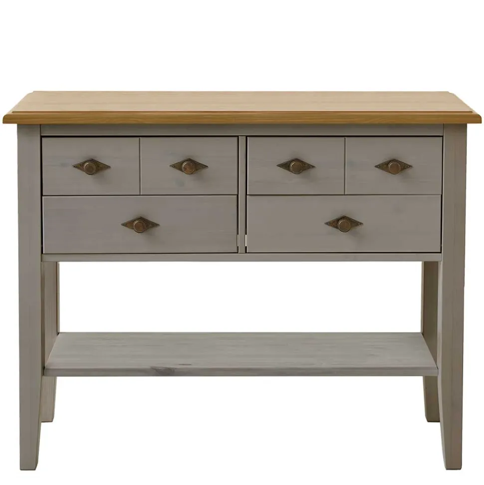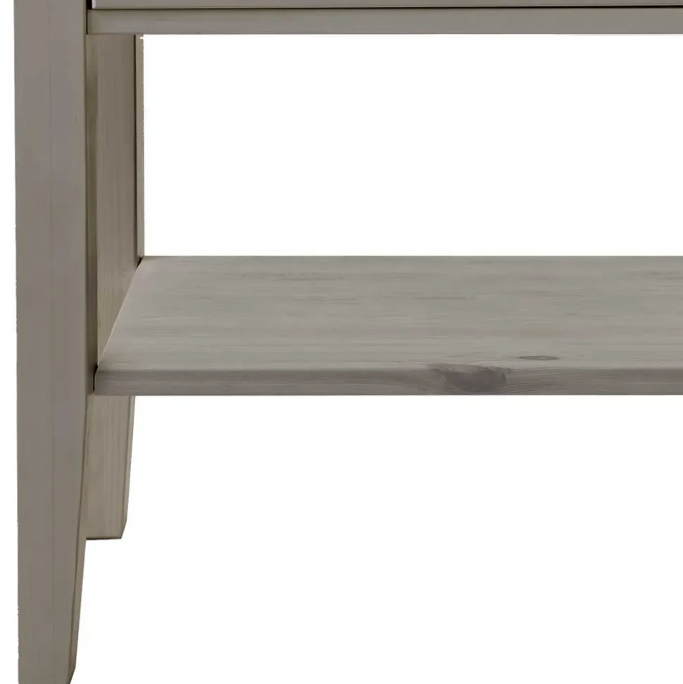 Die Oberflächen sind in einem ansprechenden Grau lackiert, das dem Landhausstil eine moderne Note verleiht. Besonderes Highlight: Die Äste des Kiefernholzes scheinen durch die Lackierung hindurch, was eine einzigartige, naturbelassene Optik erzeugt. Diese Technik sorgt dafür, dass die natürliche Struktur des Holzes sichtbar bleibt, während die Lackierung gleichzeitig Schutz bietet und das Möbelstück widerstandsfähig gegen Abnutzung und Kratzer macht. Dank dieser Beschichtung lässt sich die Oberfläche leicht reinigen und pflegen, was den Alltag erheblich erleichtert.