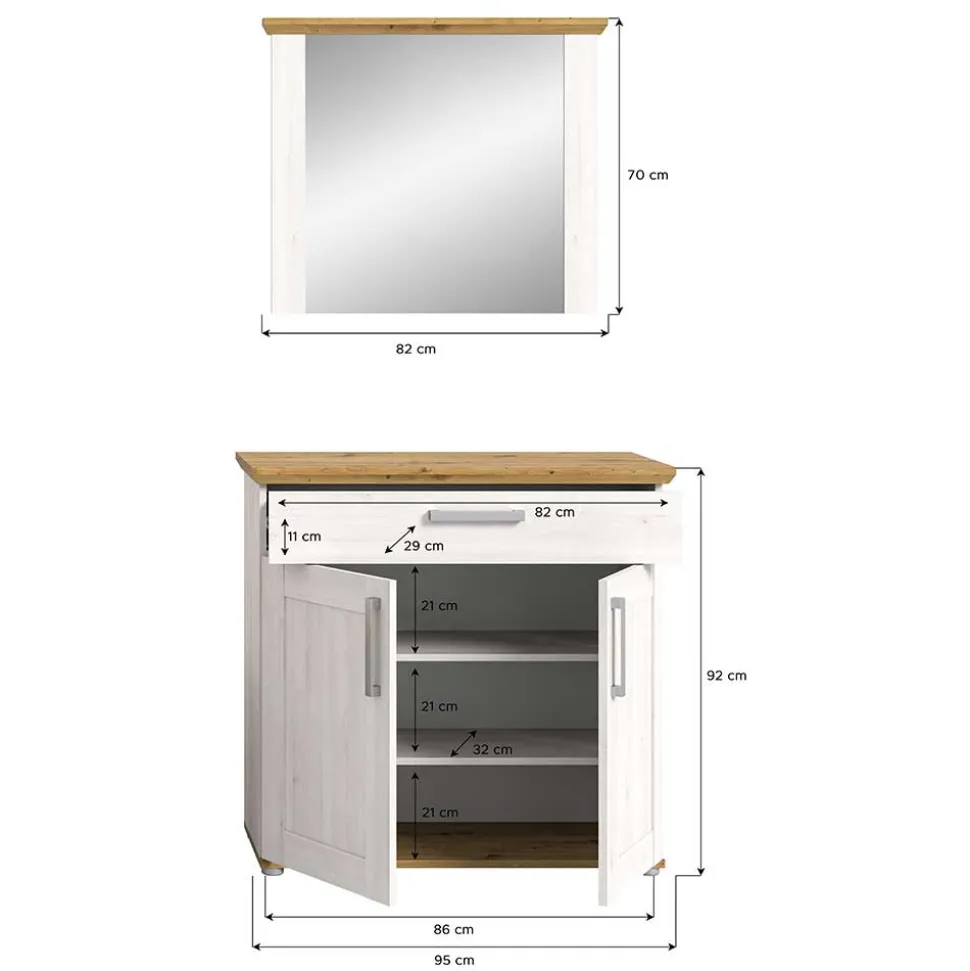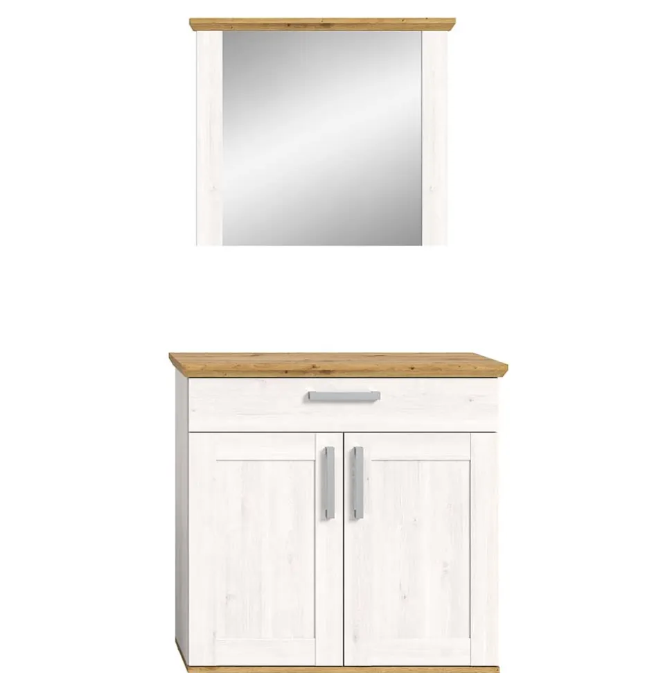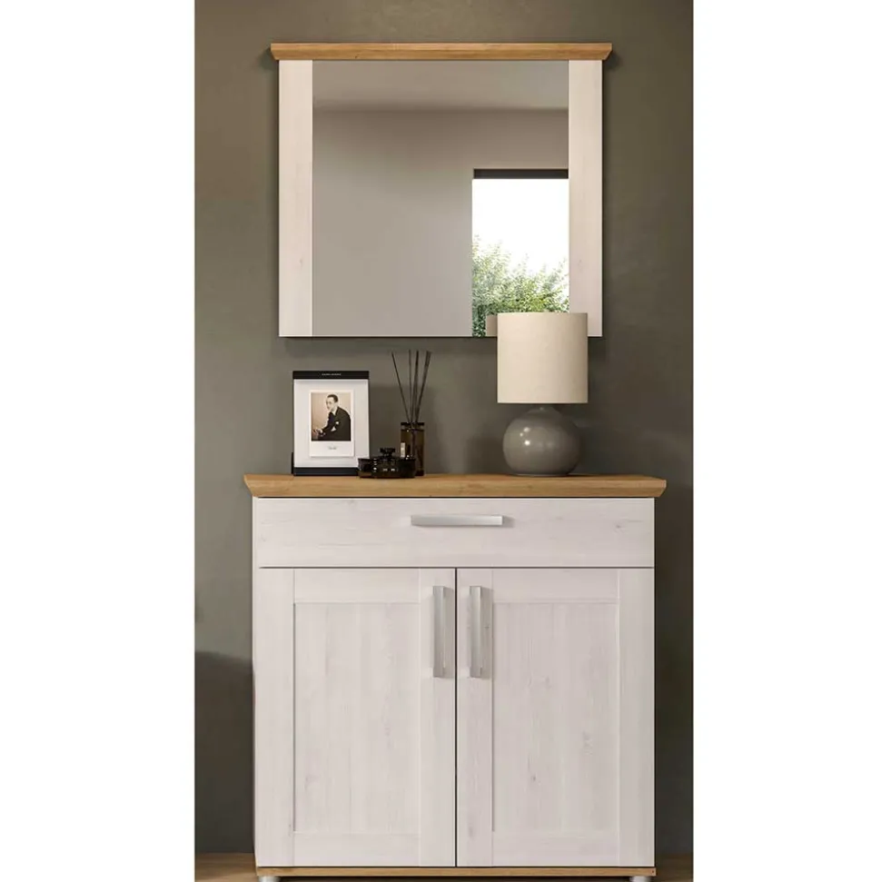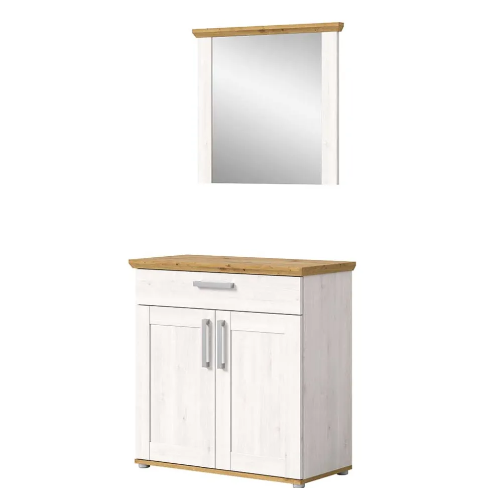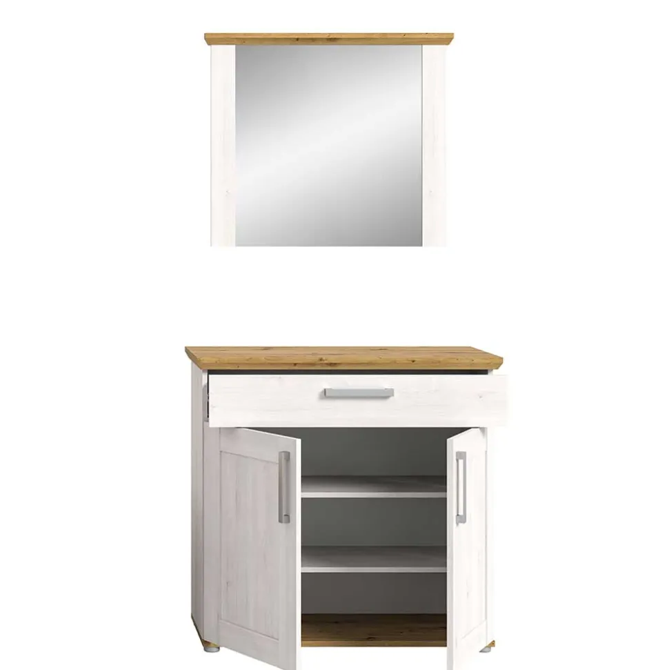 Mit dem Spiegel- und Schuhkommoden-Set „Tocella“ bringen Sie Landhausflair in Ihren Flur, die Diele oder den Eingangsbereich. Die Kombination aus schlichter Eleganz in weißer Lärche Holzoptik und warmen Wildeiche-Tönen sorgt für eine einladende Atmosphäre und ist ein echter Hingucker. Dieses zweiteilige Set setzt nicht nur optische Akzente, sondern bietet auch praktischen Stauraum und eine clevere Lösung für die Organisation Ihrer Schuhe und Accessoires.