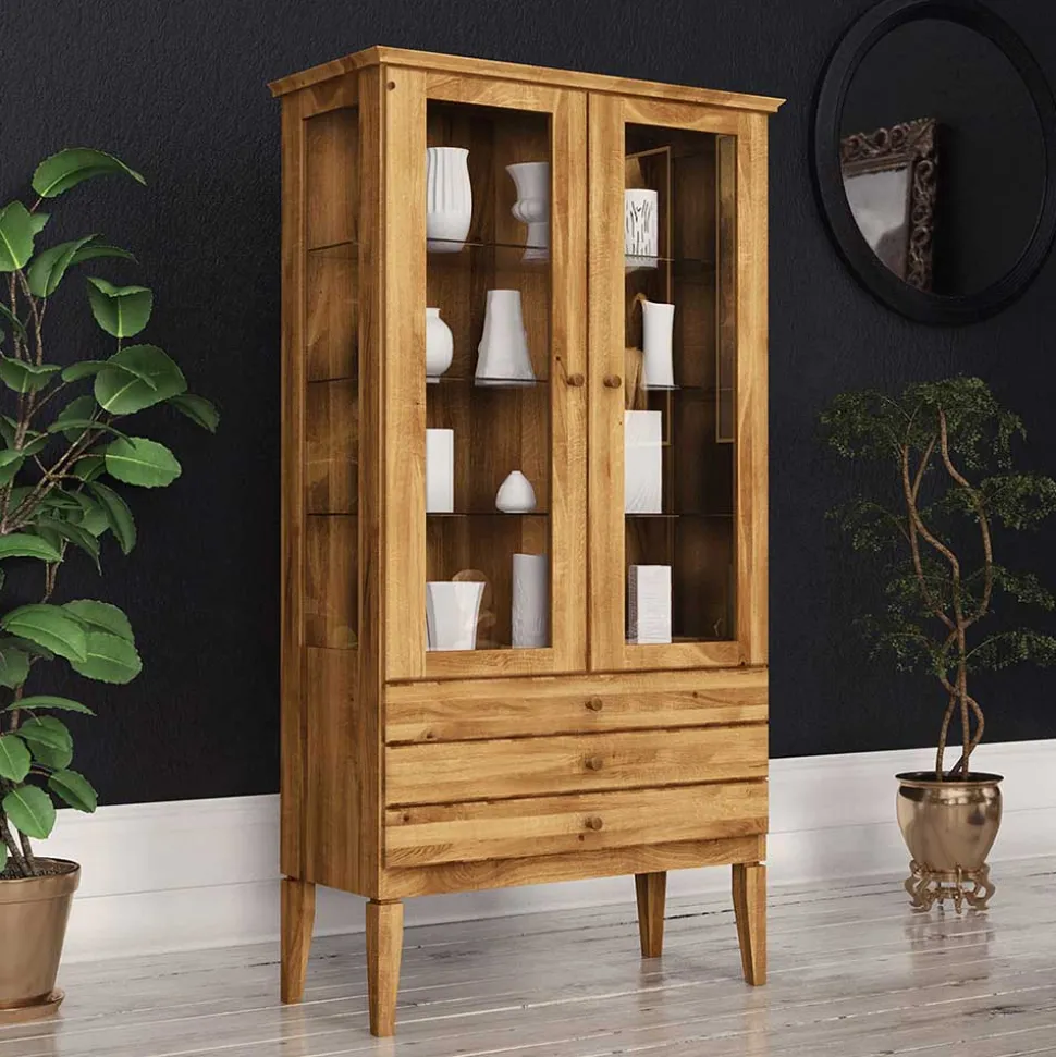Hinter den beiden Türen mit Glaseinsatz und der geräuscharmen Soft Close Funktion verbergen sich drei Glasböden, die einen leichten und offenen Eindruck vermitteln und Ihre Ausstellungsstücke optimal in Szene setzen. Die seitlichen Glaseinsätze erhöhen die Sichtbarkeit und tragen zum leichten, transparenten Design bei. Die drei Schubladen am unteren Ende bieten zusätzlichen Platz und sind mit einem hochwertigen Metallauszug sowie ebenfalls mit der Soft Close Funktion ausgestattet, was die Nutzung sanft und leise macht.