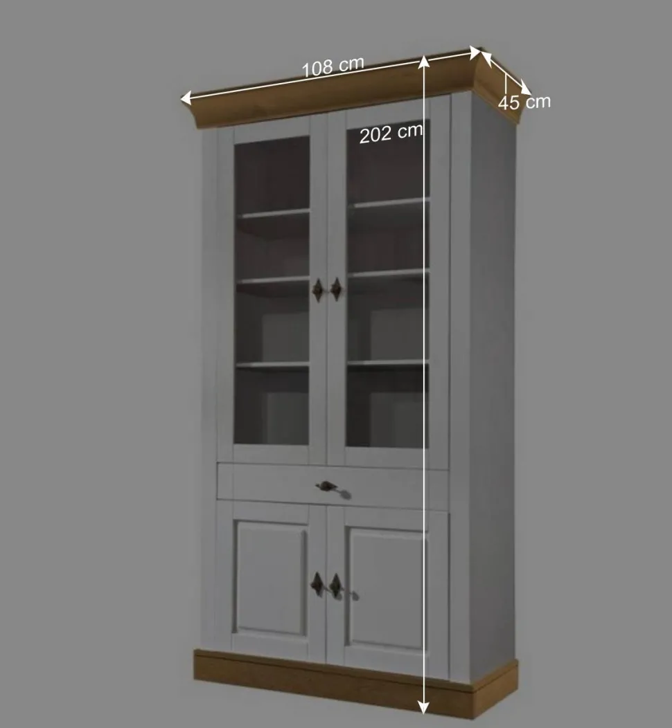 Mit einer Breite von 108 cm, einer Höhe von 202 cm und einer Tiefe von 45 cm bietet die Vitrine „Sibiuta“ großzügigen Stauraum für all Ihre Schätze. Hinter den zwei Glas- und zwei Holztüren, alle gesichert durch stabile Metallscharniere, verbergen sich mehrere Einlegeböden. Dabei bieten die Glastüren mit ihren drei Einlegeböden nicht nur Platz, sondern auch einen geschmackvollen Blick auf Ihre ausgestellten Gegenstände. Die Holztüren verbergen einen weiteren Einlegeboden, ideal für alles, was nicht sofort ins Auge fallen soll. Abgerundet wird das Stauraumangebot durch eine geräumige Schublade, die dank ihres Metallauszugs leichtgängig und stabil ist.