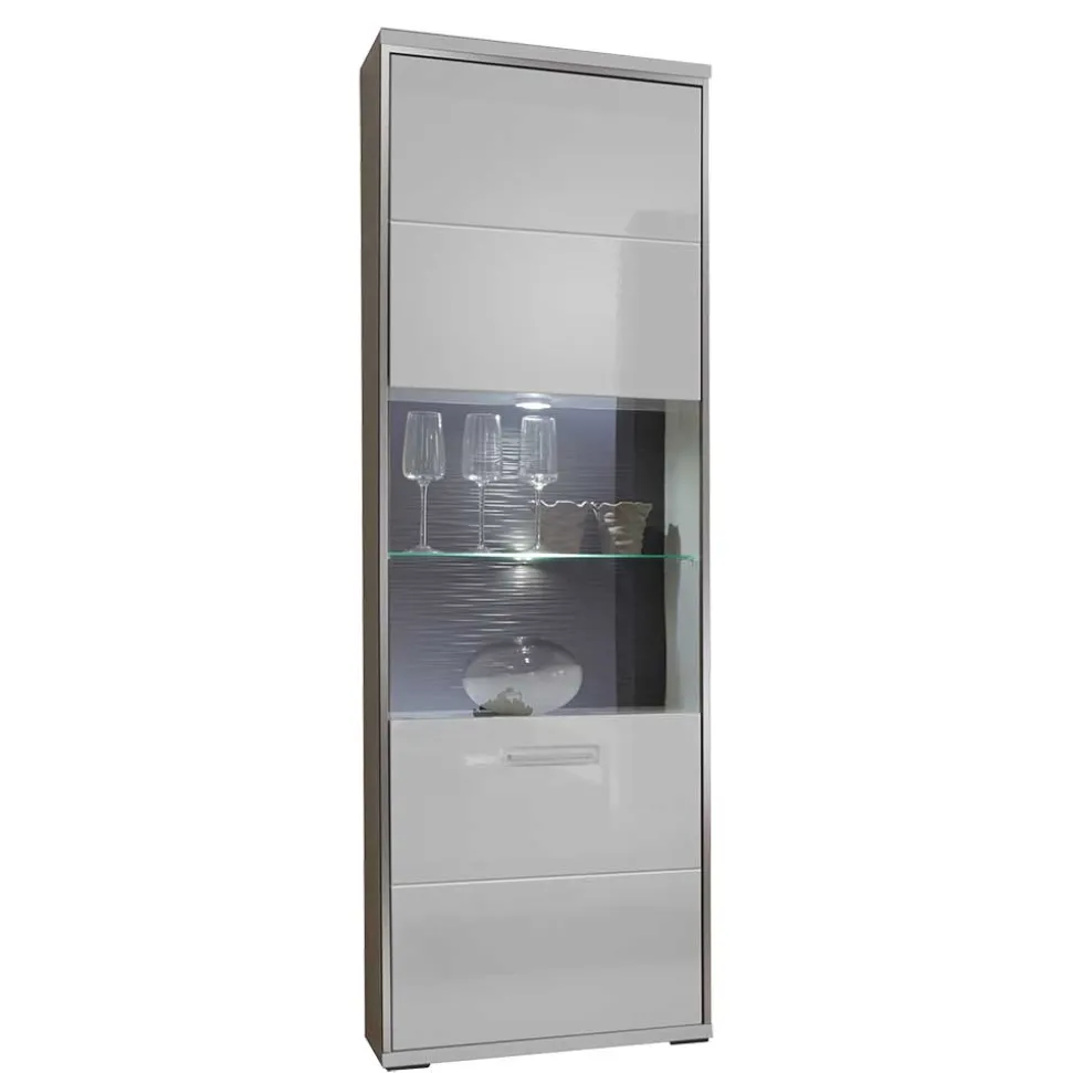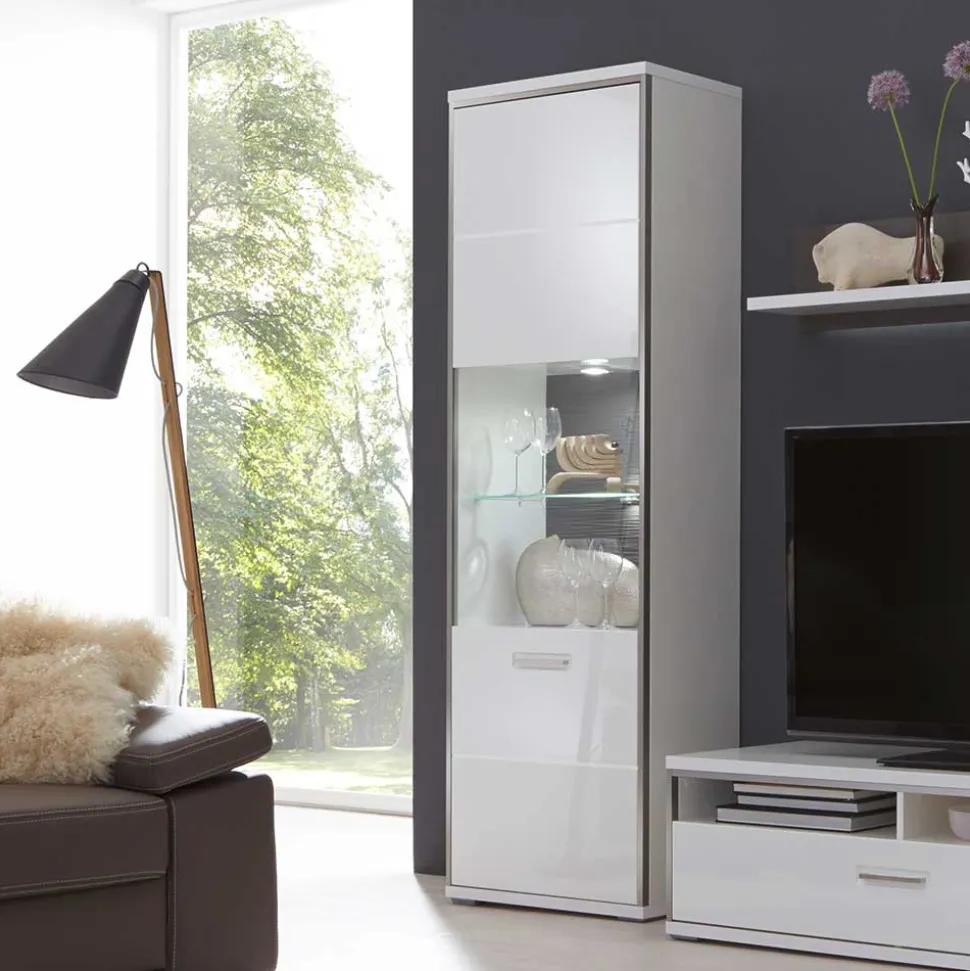 Das moderne Design der „Tacroma“ Vitrine zeichnet sich durch klare Linien und eine schlichte Eleganz aus. Es passt sich mühelos verschiedenen Einrichtungsstilen an und verleiht jedem Raum eine zeitgemäße Note. Mit ihrer hochglänzenden Front und dem edelstahlfarbigen Metallrahmen wird diese Vitrine zum Mittelpunkt Ihres Wohnbereichs.
