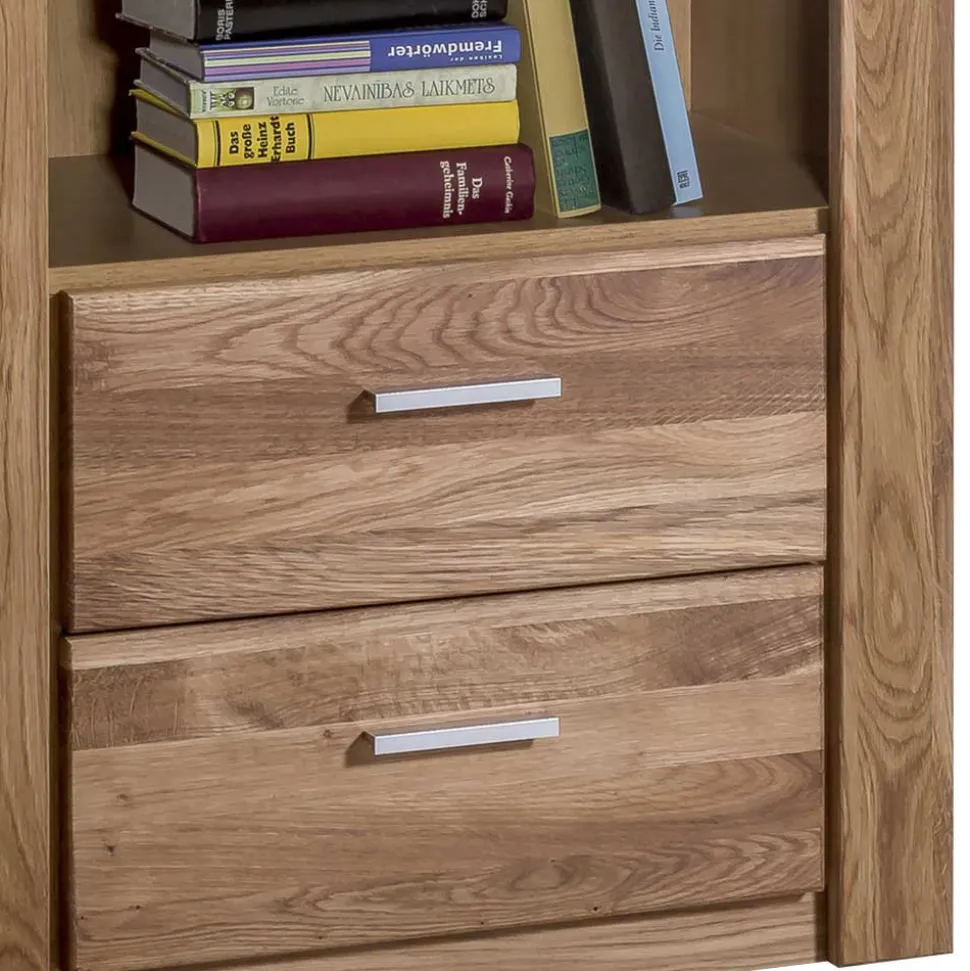 Hergestellt aus massiver Wildeiche an der Front und qualitativer Spanplatte am Korpus, kombiniert „Maila“ Robustheit mit Ästhetik. Die natürlich geölten Holzoberflächen betonen die lebendige Maserung der Wildeiche, während die in Holzoptik folierte Spanplatte Beständigkeit und Pflegeleichtigkeit garantiert. Die Folierung, ein Veredelungsprozess, schützt das Material und sorgt für eine attraktive, langlebige Oberfläche, die sich leicht reinigen lässt.