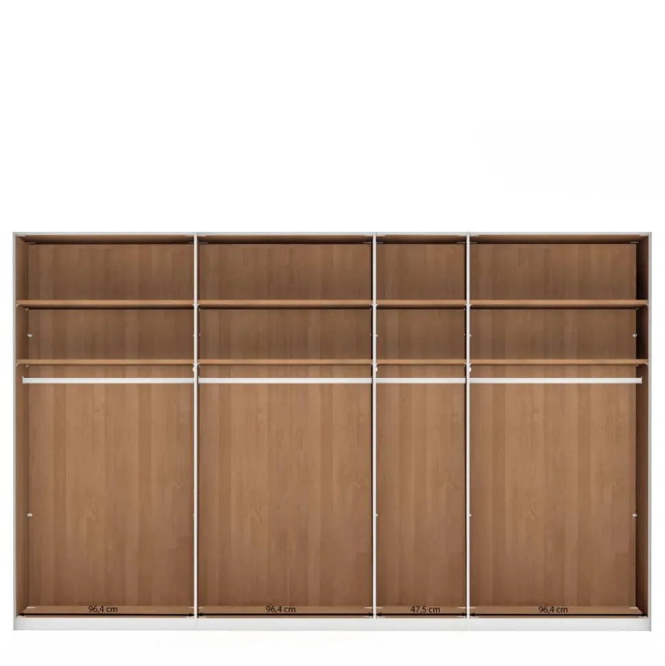 Der Schrank gliedert sich in vier Abteile: zwei breite Fachabteile mit jeweils ca. 96,4 cm Innenmaß, ein schmales mit ca. 47,5 cm und ein weiteres breites Fachabteil. Jedes Abteil ist ausgestattet mit zwei stabilen Einlegeböden (22 mm stark, je bis 20 kg belastbar) und einer Kleiderstange, die bis zu 40 kg trägt. Bodenträger und Kleiderstangenhalterungen sind aus Metall gefertigt und sorgen für dauerhafte Stabilität. Die Türen schließen sanft und leise dank Soft-Close-Metallscharniere.