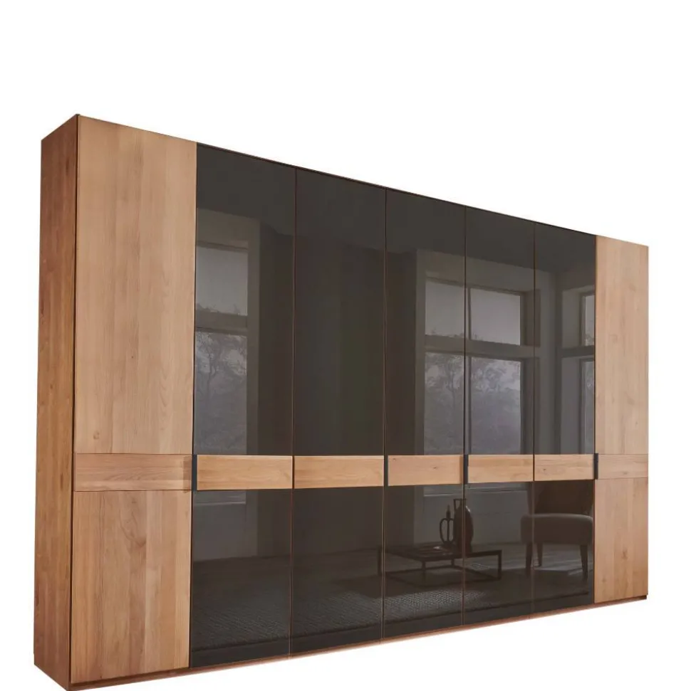 Ein Möbelstück, das Raum formt und Atmosphäre schafft: Der 7-türige teilmassive Schrank „Hung“ verbindet großzügigen Stauraum mit einer spannenden Materialkomposition. Die beiden äußeren Türen aus Massivholz Erle bringen natürliche Wärme ins Design, während die fünf mittleren Türen mit dunkelbrauner Glasbeschichtung für moderne Klarheit sorgen. Mit einer Breite von 344 cm eignet sich dieser Schrank ideal für große Schlafzimmer oder Ankleidezimmer, in denen Ordnung und Stil Hand in Hand gehen. Gefertigt in Deutschland, steht „Hung“ für Qualität, Langlebigkeit und ein durchdachtes Wohngefühl.