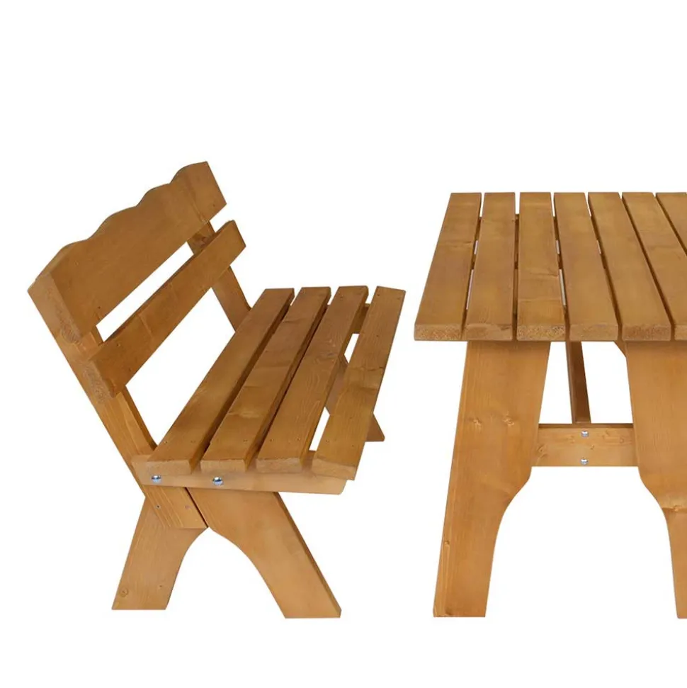 Dank der speziellen hellbraunen Imprägnierung im Tauchverfahren ist das Holz optimal gegen Witterungseinflüsse geschützt. Feuchtigkeit perlt an der wasserfesten Oberfläche ab, sodass die Sitzgruppe auch bei Regen oder Morgentau im Freien stehen kann. Dies bedeutet weniger Pflegeaufwand und eine dauerhaft schöne Optik – Jahr für Jahr.
