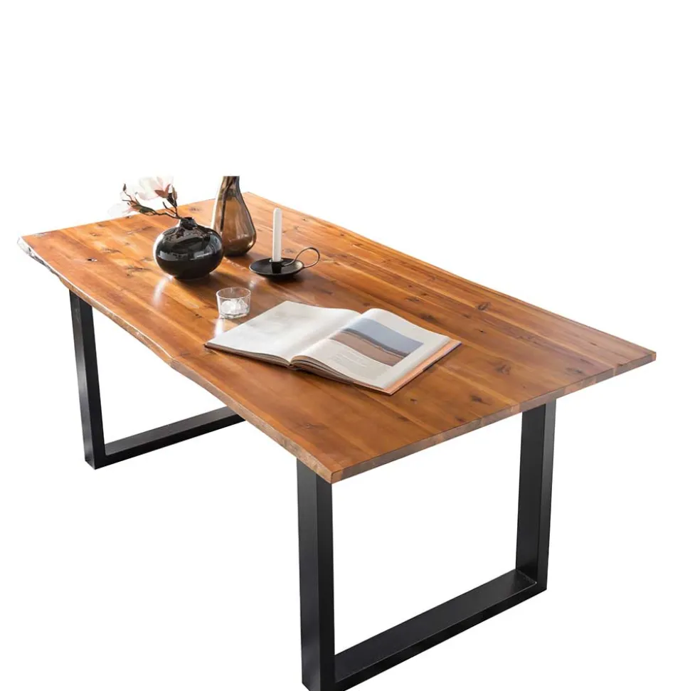 Tiefe der Tischplatte variiert leicht, was den natürlichen Ursprung des Holzes widerspiegelt. Ein schwarzes Metall-Bügelgestell verleiht dem Tisch nicht nur eine moderne, industrielle Optik, sondern sorgt auch für maximale Stabilität und Bewegungsfreiheit unter der Tischfläche. Diese Bauweise schafft eine luftige Anmutung und lässt den Raum offener wirken.