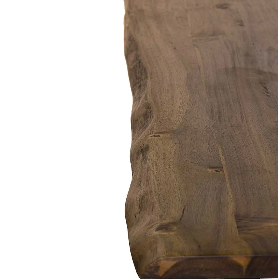 Der Esstisch überzeugt mit einer massiven Akazienholzplatte, die durch ihre markante Baumkante und das seidenmatte Finish in Walnussbraun eine natürliche, individuelle Ausstrahlung erhält. Jede Platte ist ein Unikat, da sie direkt aus dem Stamm geschnitten wird. Das robuste Metall-Bügelgestell in Schwarz setzt einen modernen Kontrast und sorgt für stabilen Stand.