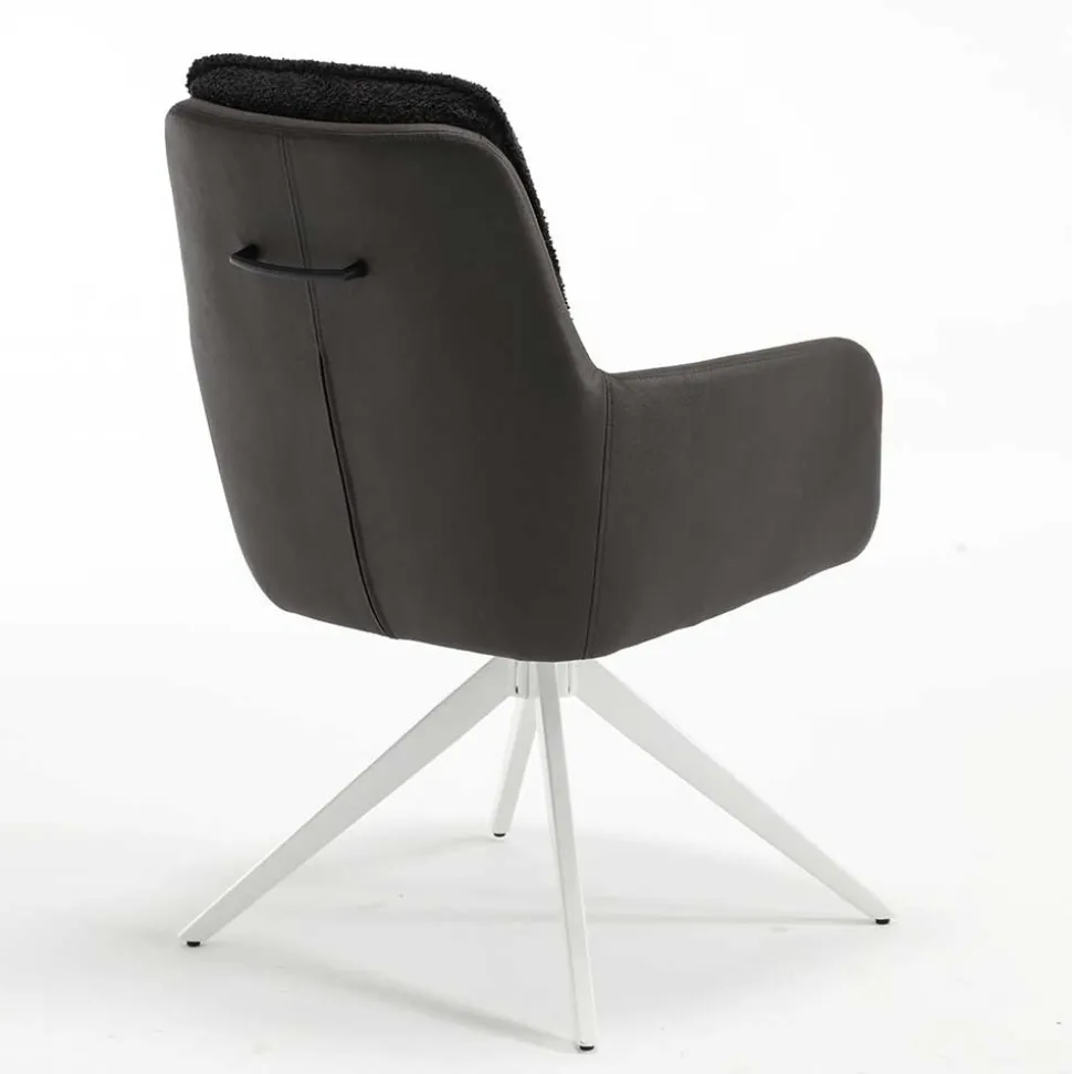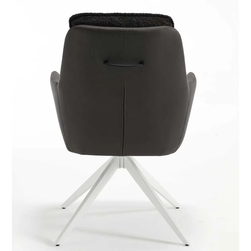 Hergestellt aus strapazierfähigem, anthrazitfarbenem Boucle-Bezug und ergänzt durch Kunstleder an den Armlehnen und der Außenseite, bietet der „Garrysa“ eine luxuriöse Oberflächenbeschaffenheit. Boucle ist bekannt für seine weiche, texturierte und dabei enorm widerstandsfähige Qualität, was den Stuhl besonders pflegeleicht macht. Das Kunstleder ergänzt mit seiner glatten, eleganten Optik und bietet eine ideale Kombination für den täglichen Gebrauch und besondere Anlässe.