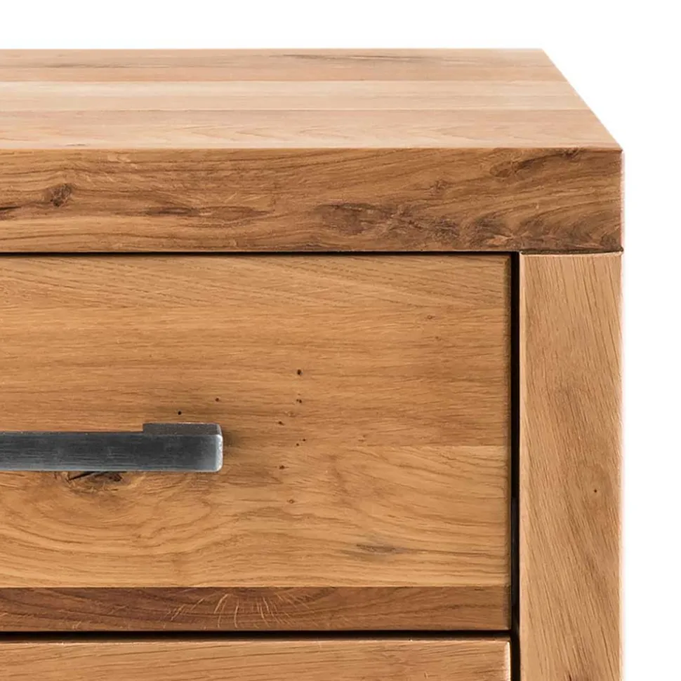 Eine kleine Kommode im Format 50x50x38 cm, welche sich perfekt unterhalb des Wandspiegels mit Holzrahmen im Format 50x140x2 cm, komplettiert das Garderobenmöbel Set aus Wildeiche und Eisen Mulcian. Die Kommode verfügt über zwei Schubladen auf Metallschienen mit Soft-Close-Funktion.