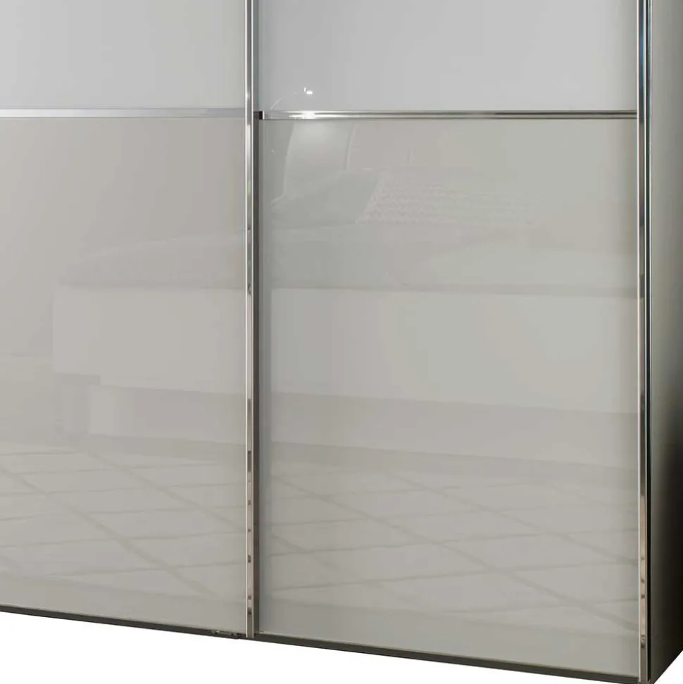 Der Schwebetürenschrank bietet nicht nur viel Stauraum, sondern auch ein optisches Highlight in jedem Schlafzimmer. Die vier Schwebetüren lassen sich synchron öffnen, wodurch ein müheloser Zugriff auf die vier Fachabteile mit jeweils zwei Einlegeböden und einer Kleiderstange ermöglicht wird. Dekorative Querriegel in Chrom und zwei LED-Aufbauleuchten verleihen dem Schrank eine moderne Note und sorgen für eine angenehme Beleuchtung.